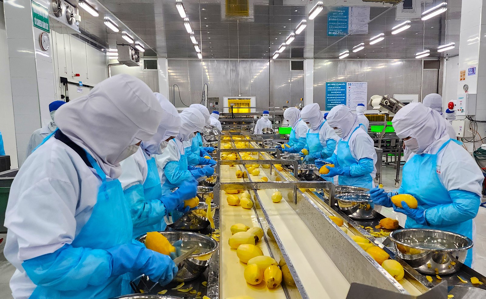 Công nhân Công ty Cổ phần Rau quả thực phẩm An Giang (Antesco) chế biến xoài xuất khẩu. Ảnh: HẠNH CHÂU