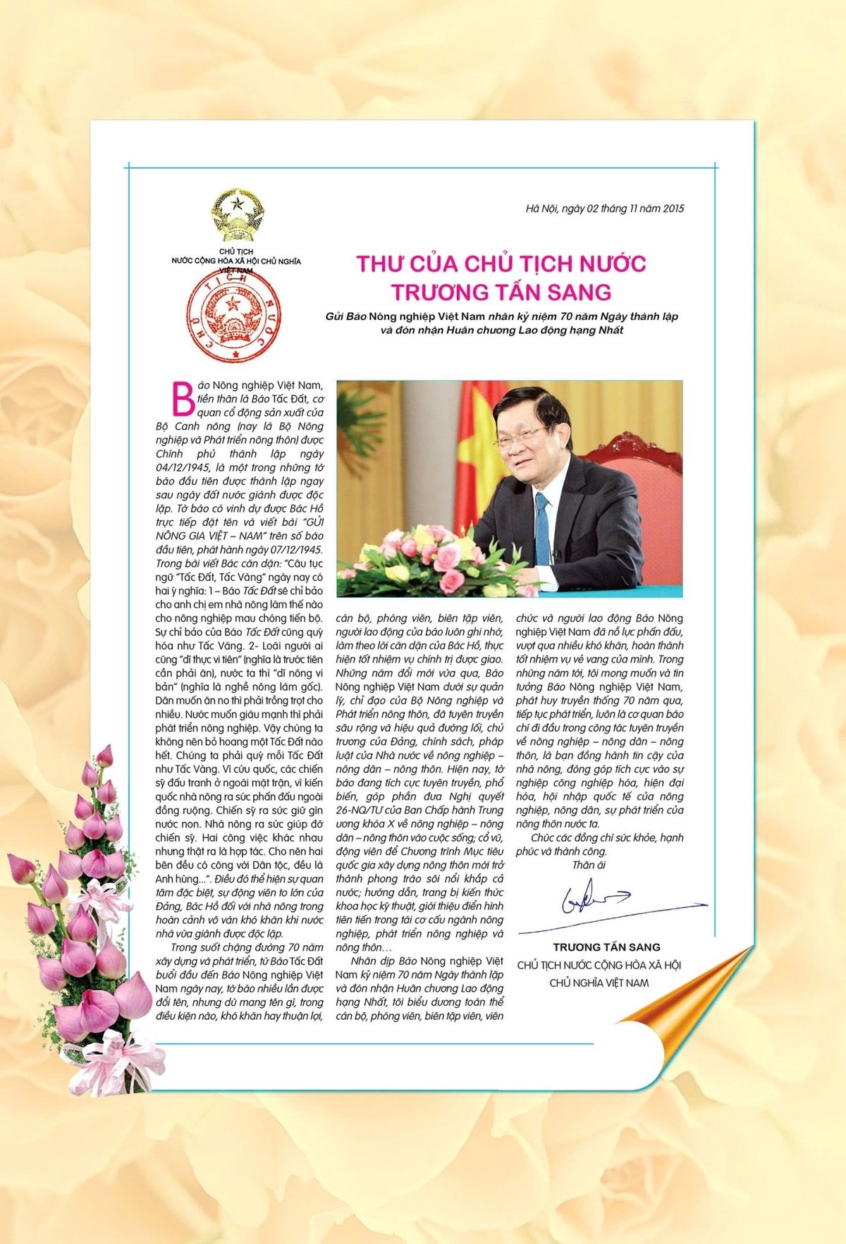 Trong dịp kỷ niệm 70 năm ngày thành lập Báo Nông nghiệp Việt Nam, Chủ tịch Nước Trương Tấn Sang đã gửi Thư động viên cán bộ, bên tập viên, phóng viên, nhân viên Báo Nông nghiệp Việt Nam, trong thư Chủ tịch Nước Trương Tấn Sang viết: