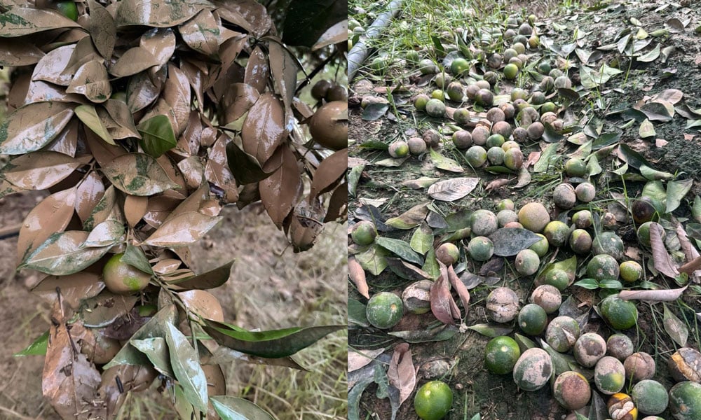 Nhà vườn Sảng Bình, tổ dân phố Trại 3, phường Phượng Sơn có gần 2 nghìn cây cam ngọt đang trong thời kỳ phát triển quả; năng suất ước đạt 50 tấn. Mưa lũ đã gây ngập úng gần 1 nghìn cây, thiệt hại ước tính hơn 2 tỷ đồng. |