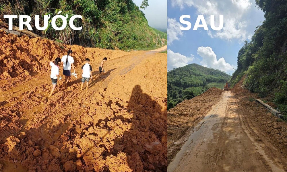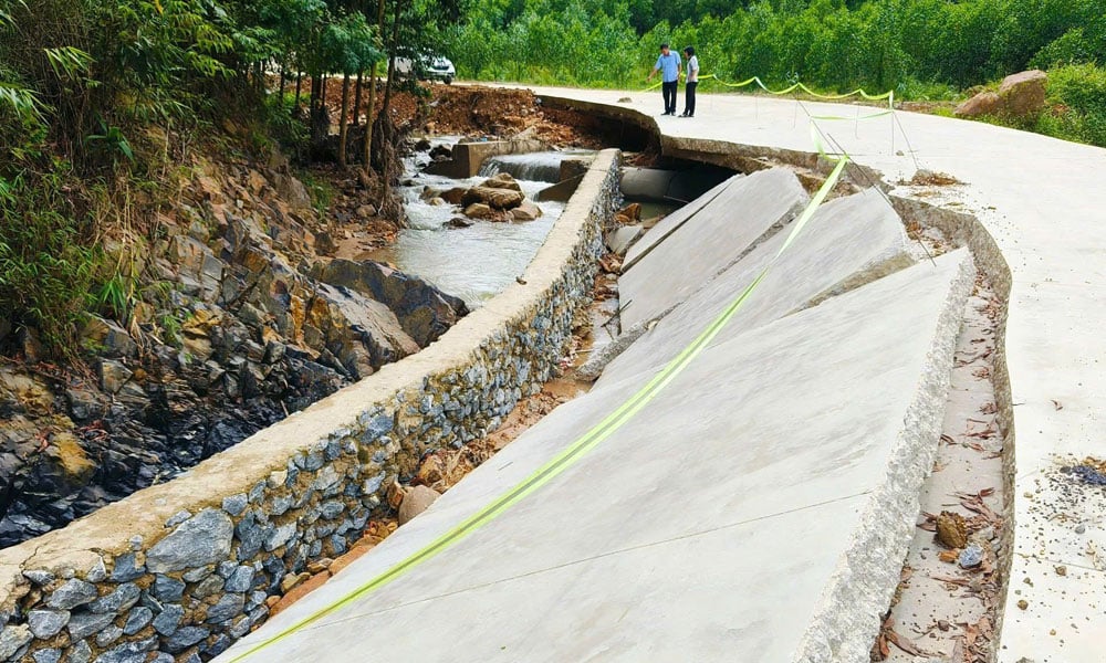 Tính đến sáng 3/10, toàn tỉnh xảy ra 27 điểm sạt lở đất, 10 điểm sạt lở đường với hàng nghìn m3 đất, đá, bê tông. Ngoài ra còn xảy ra một số sự cố đê điều. Chính quyền địa phương cùng lực lượng chức năng đã phối hợp tập trung xử lý ngay từ giờ đầu; cắm biển cảnh báo khu vực nguy hiểm để người dân phòng, tránh. Ảnh: Một điểm sạt lở trên tuyến đường thôn Đồng Tàn (xã Sơn Động). |