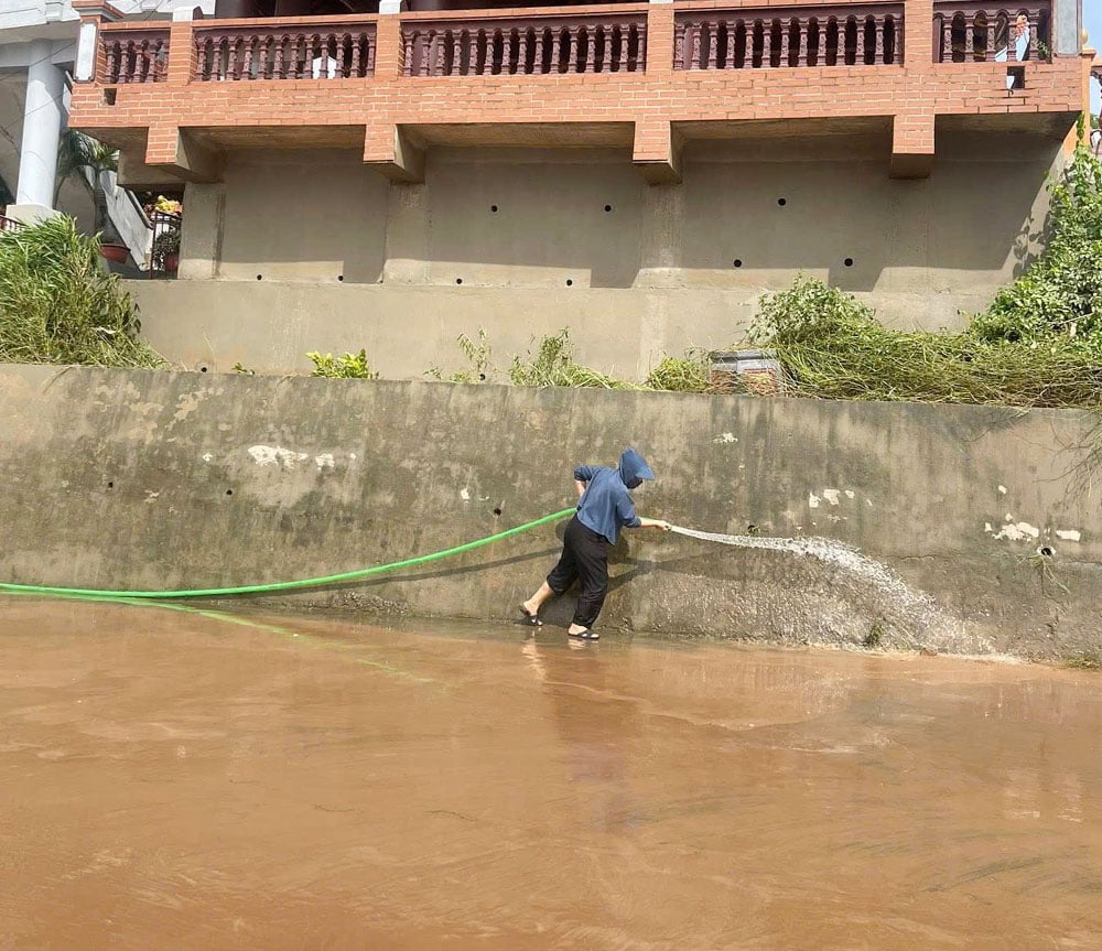 Sau khi lũ rút, người dân phường Chũ khẩn trương dọn rửa bùn đất trên các tuyến đường, công trình. |