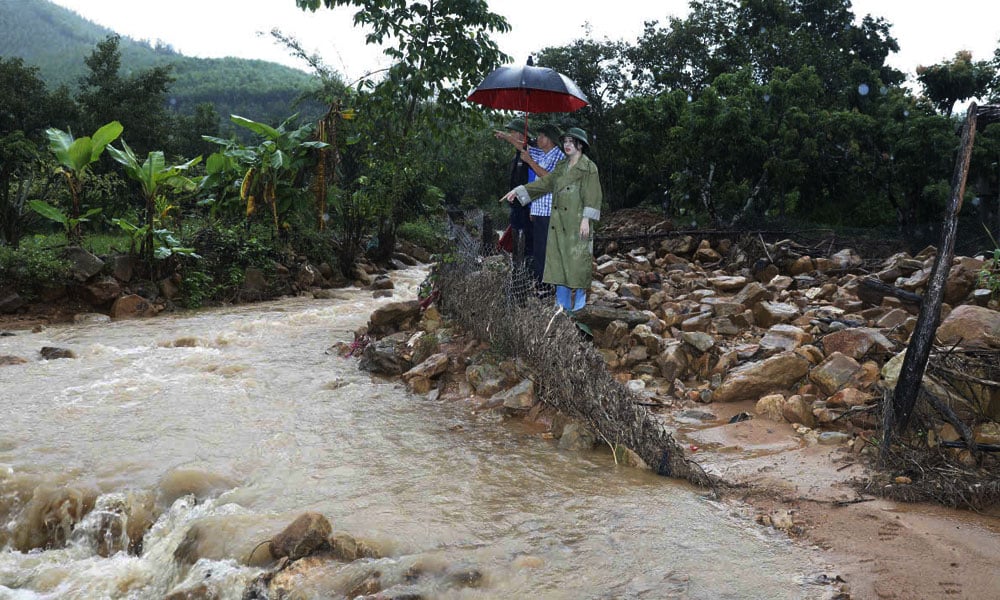 Trước đó, chiều 6/10, khi mưa bắt đầu dồn dập, tại xã Yên Định, Bí thư Đảng ủy xã Chu Thị Toan và Chủ tịch UBND xã Nguyễn Thành Phong trực tiếp xuống thôn Đồng Hả kiểm tra hiện trường tuyến đường bê tông bị sạt lở, xói móng nền đường, ảnh hưởng trực tiếp đến an toàn giao thông của Nhân dân.
