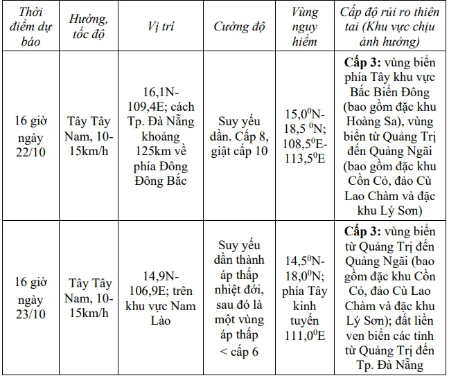 Vùng biển từ Quảng Trị đến Quảng Ngãi (bao gồm đặc khu Cồn Cỏ, đảo Cù Lao Chàm và đặc khu Lý Sơn) có gió mạnh cấp 6, từ sáng ngày 22/10 tăng lên cấp 7, vùng gần tâm bão đi qua cấp 8, giật cấp 10, sóng biển cao 3 - 5 m, biển động mạnh.