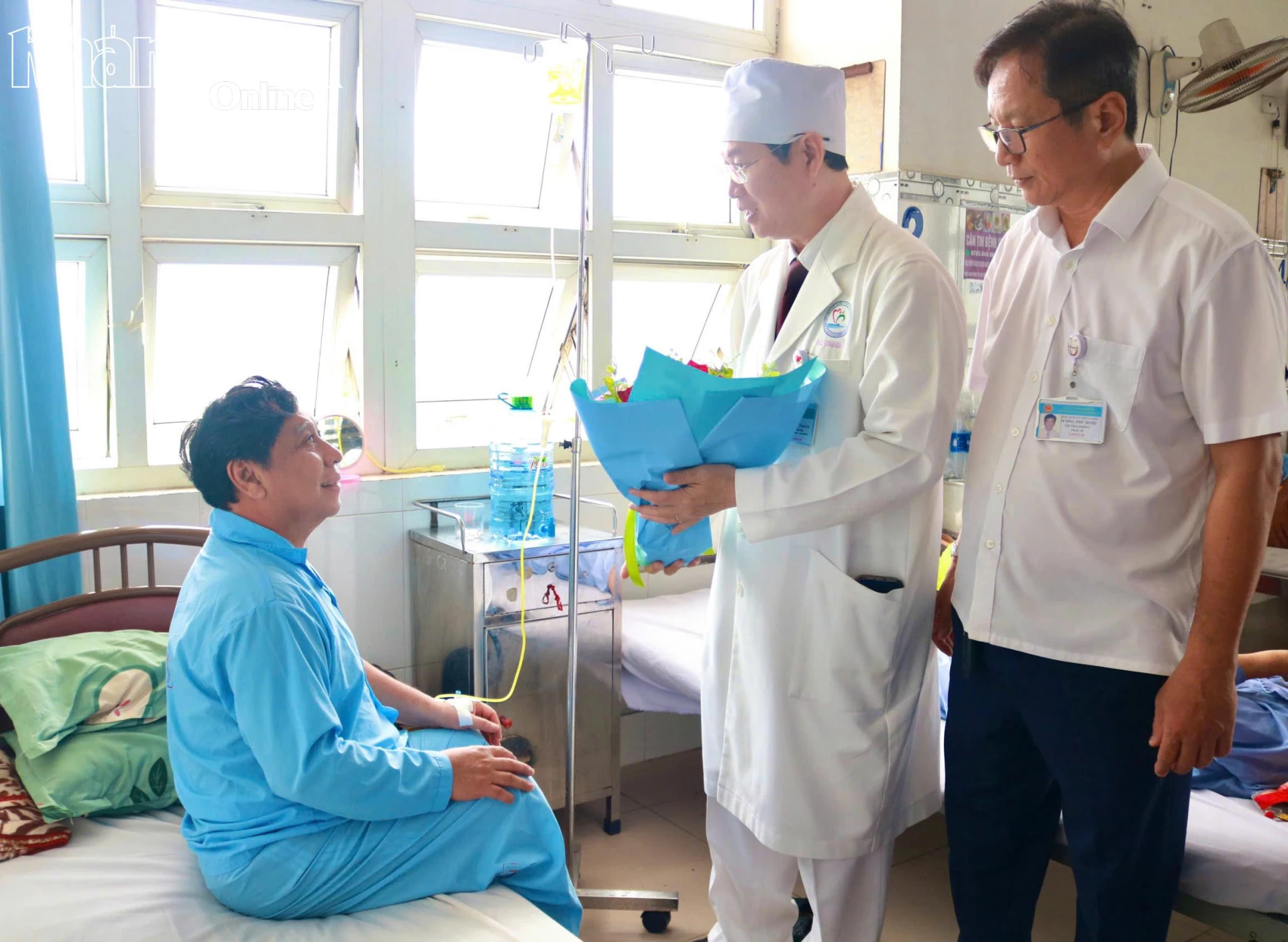 Tại các giường bệnh, lãnh đạo bệnh viện gửi lời chúc mừng, tri ân các thầy, cô giáo; đồng thời động viên tinh thần, tiếp thêm nghị lực giúp các nhà giáo vượt qua khó khăn, cố gắng điều trị để sớm trở về với gia đình và bục giảng.