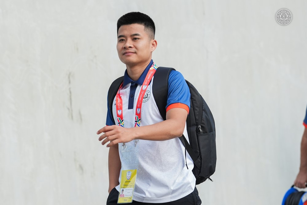 Thủ thành Nguyễn Filip xuất tướng khi lao ra khỏi vòng cấm, phá bóng ngay trước khi cầu thủ BG Pathum có thể chạm bóng.