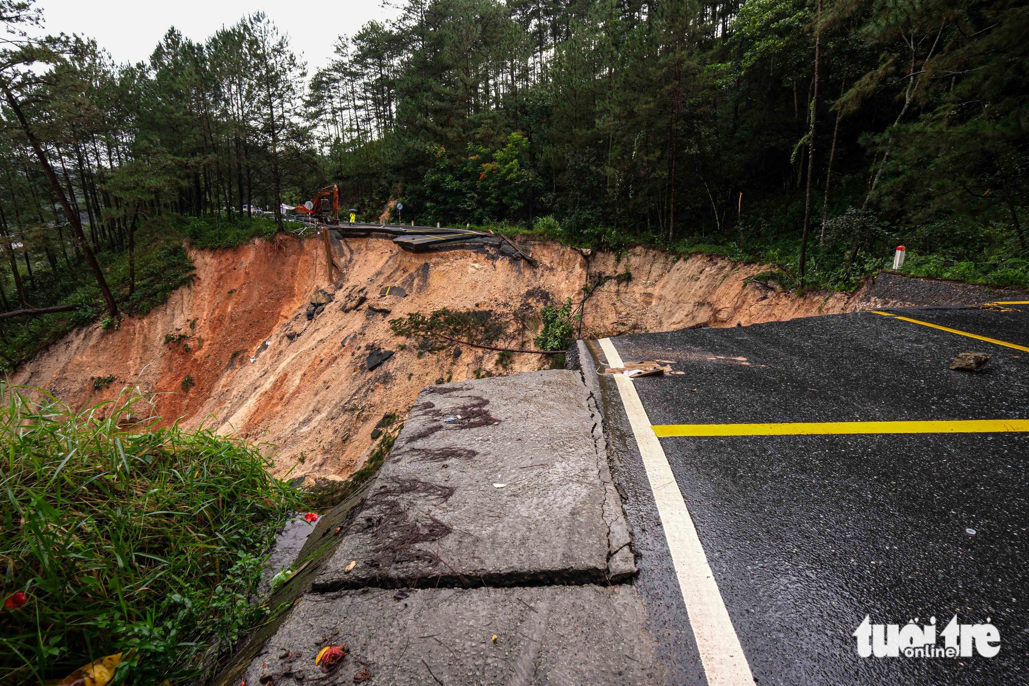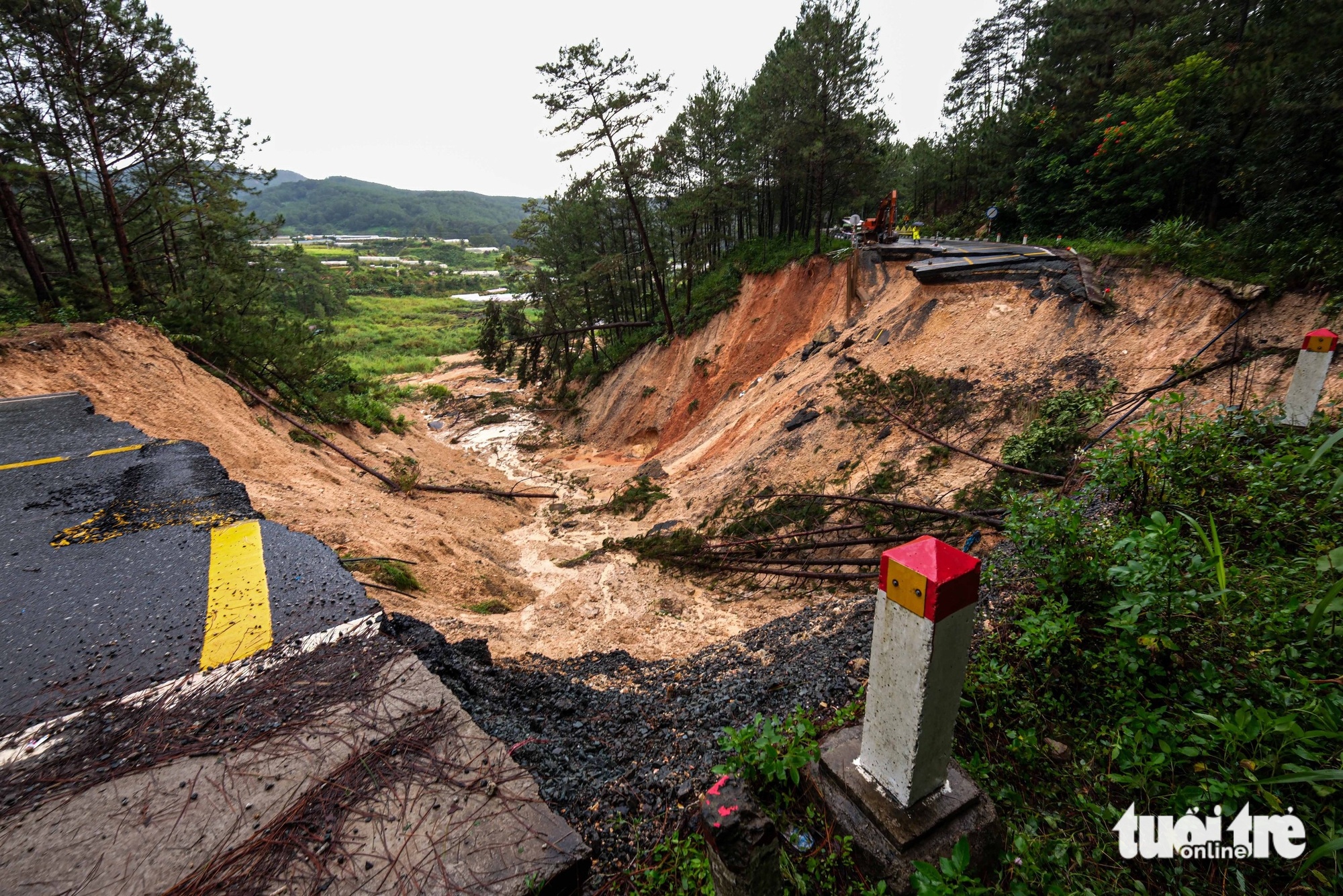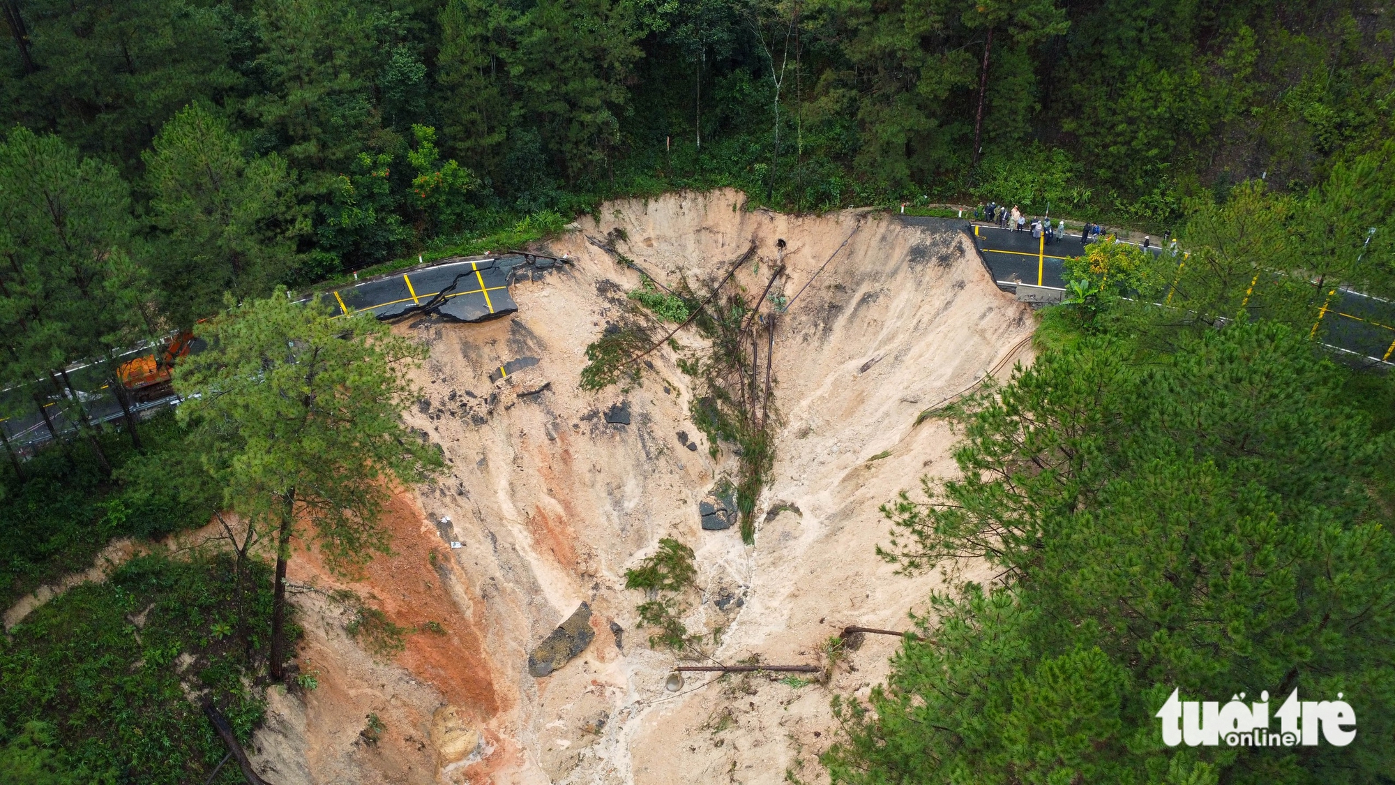 Ghi nhận tại hiện trường, hố sụt ngoạm sâu vào sườn đèo giữa rừng thông. Thân đường nhựa bị xé toạc, gãy gập thành mảng lớn, ống cống lộ ra. Từ vết sạt, đất đá bị đẩy xuống thung lũng.