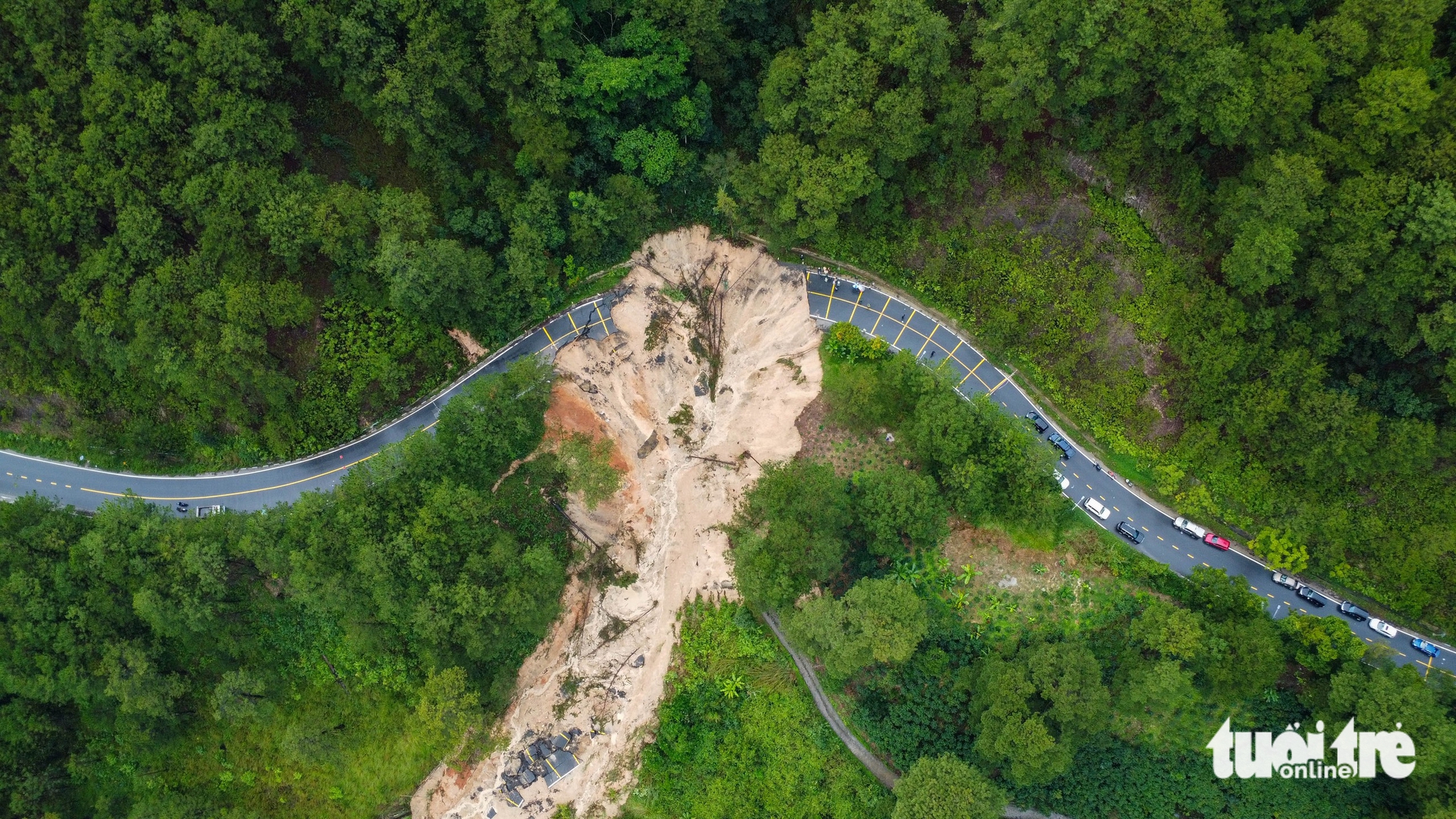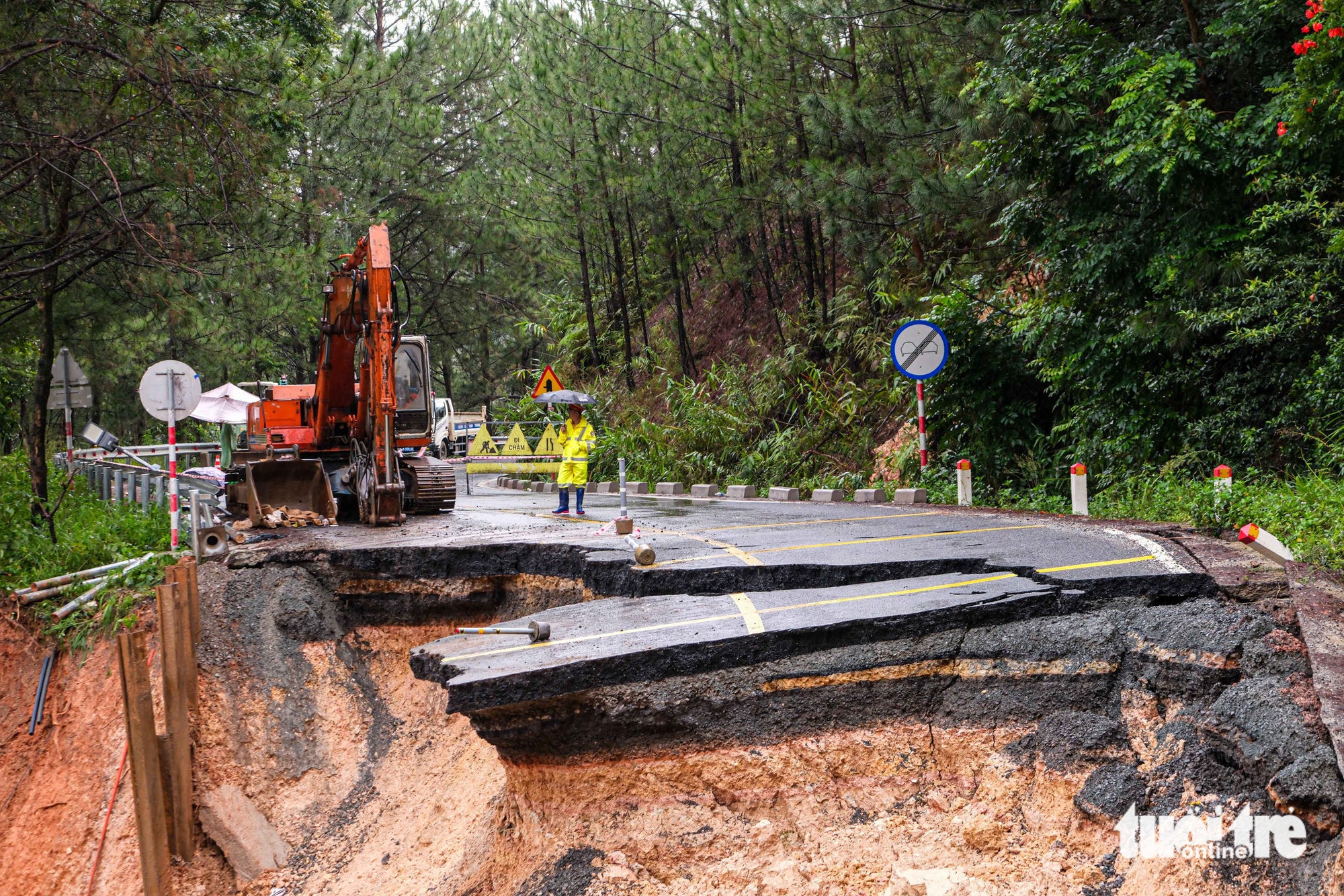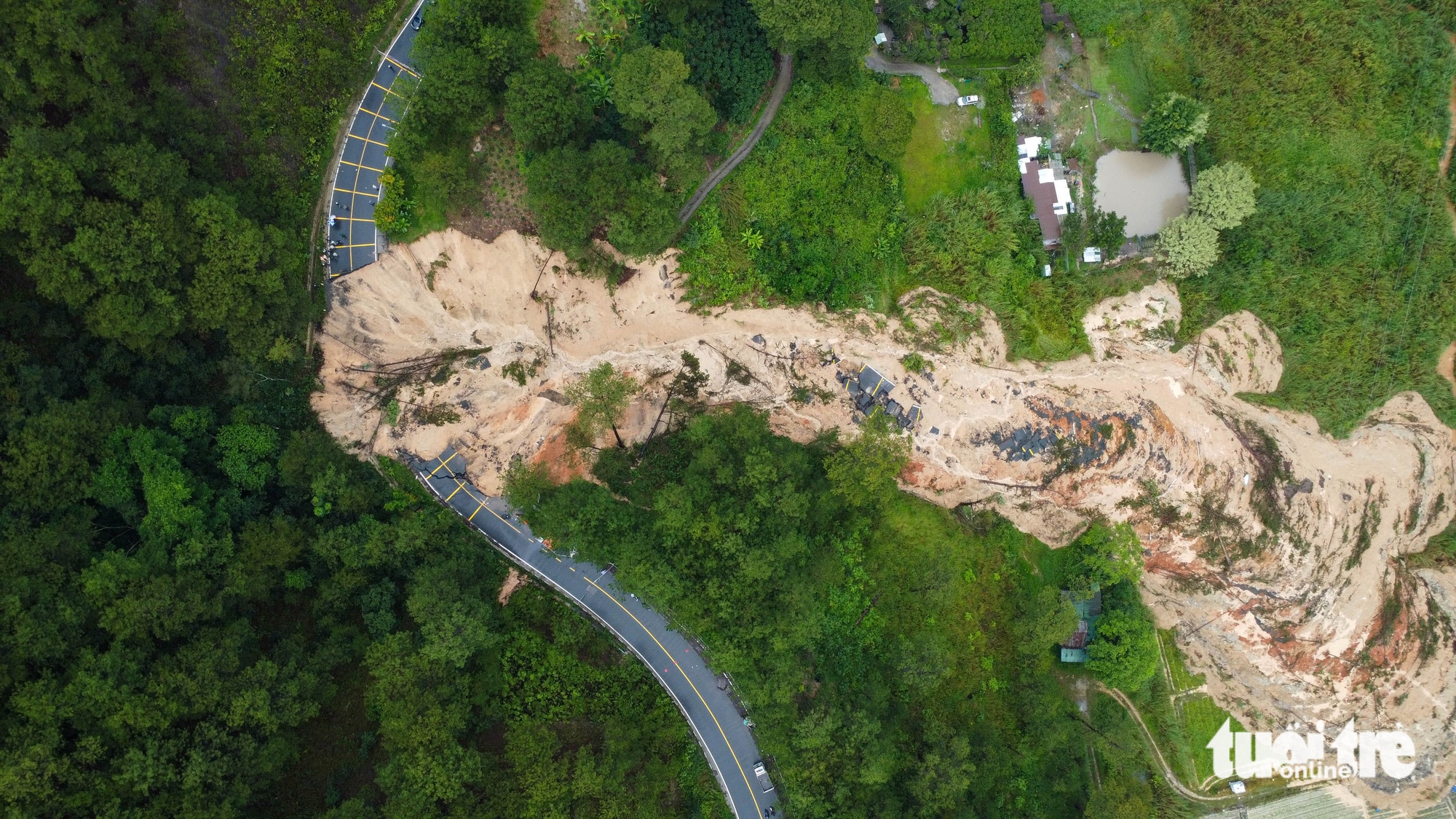 Ghi nhận tại hiện trường, hố sụt ngoạm sâu vào sườn đèo giữa rừng thông. Thân đường nhựa bị xé toạc, gãy gập thành mảng lớn, ống cống lộ ra. Từ vết sạt, đất đá bị đẩy xuống thung lũng.