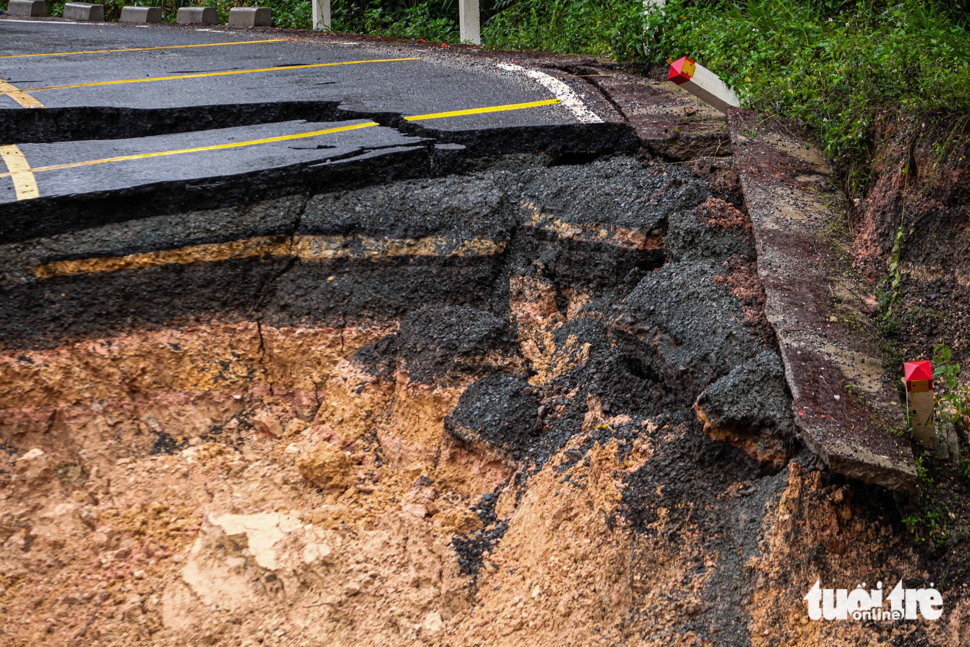 Phần mặt đường dài khoảng 100m đã bị cuốn xuống phía thung lũng - Ảnh: M.V.