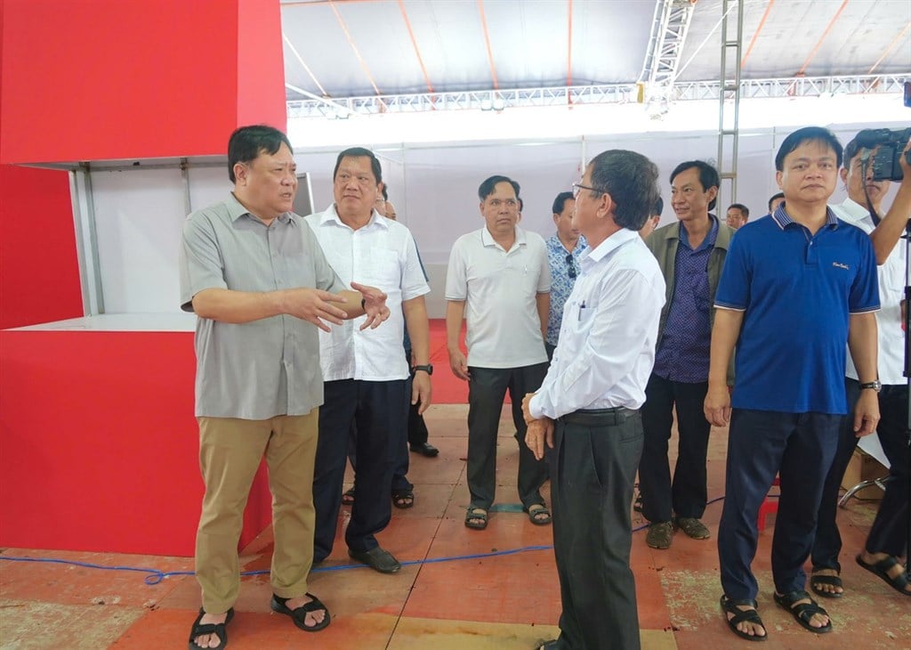 Chủ tịch UBND tỉnh Phạm Thành Ngại (bìa trái), kiểm tra công tác chuẩn bị trưng bày, triển lãm hiện vật, tư liệu Đại hội Đảng qua các thời kỳ, trưng bày sản phẩm OCOP và thành tựu phát triển kinh tế - xã hội tỉnh Cà Mau.