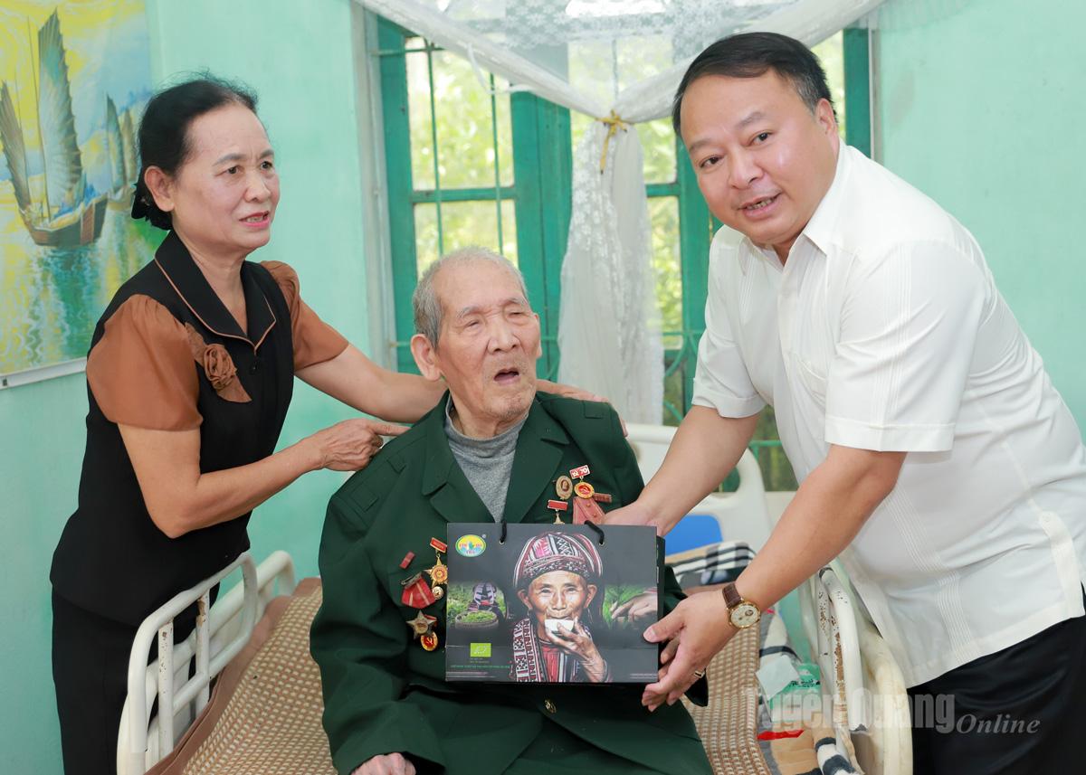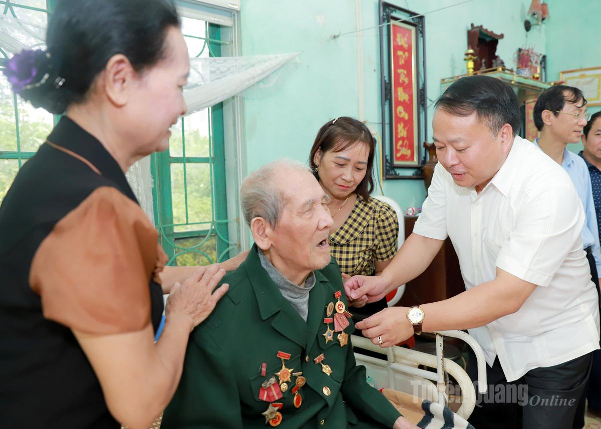 | Chủ tịch UBND tỉnh Phan Huy Ngọc trao Huy hiệu 70 năm tuổi Đảng cho đảng viên Nguyễn Văn Tiếp. |