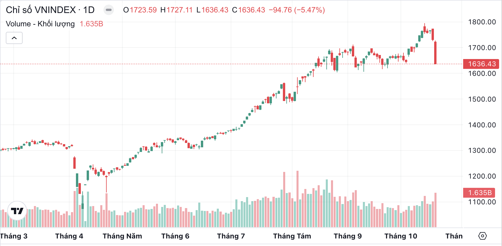 Kết phiên, VN-Index giảm 94,76 điểm, tương đương 5,47%. Chỉ số lùi về đóng cửa ở mức 1.636,43 điểm. Nếu tính theo điểm số, phiên hôm nay ghi nhận mức giảm kỷ lục từ trước đến nay.