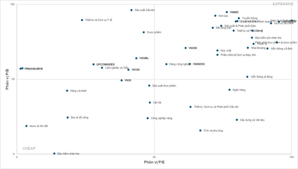 Theo đó, tính đến thời điểm hiện tại, nhóm cổ phiếu VN30, VN100 vẫn là các nhóm cổ phiếu có mức định giá thấp mặc dù các chỉ số này đã liên tục xác lập mức đỉnh kỷ lục trong thời gian qua, điều này cũng là lý do chính khiến dòng tiền vẫn chủ yếu tập trung ở nhóm vốn hóa lớn.