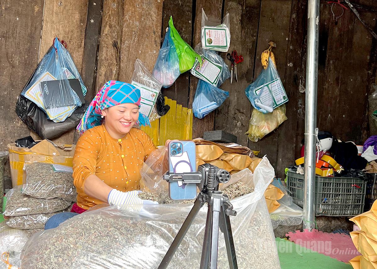 Từng bước tiếp cận với kinh tế số, thời gian qua, nông dân Tuyên Quang dưới sự hỗ trợ của chính quyền đã mở ra kênh tiêu thụ nông sản trên không gian số. Đây là hướng đi mới không chỉ rút ngắn khoảng cách địa lý mà còn nâng cao hiệu quả sản xuất và giá trị kinh tế. Vàng Thị Dính, cô gái người H’Mông ở thôn Mã Hồng, xã Nghĩa Thuận vừa thoăn thoắt đóng hàng, vừa giới thiệu công dụng của từng mặt hàng cho khách qua chiếc điện thoại thông minh. Hai vợ chồng chị Dính từng rời quê, đi làm việc ở Bắc Ninh với ước mong đổi lại cuộc sống ổn định hơn cho mình và cho con cái, bố mẹ mình. Thế nhưng, mọi thứ không như mong muốn. Hai vợ chồng về quê, lại gắn bó với nương rẫy, đàn trâu đàn bò. Dưới sự hỗ trợ của chính quyền, chị Dính mở một gian hàng trên TikTok Shop… Các mặt hàng của Vàng Thị Dính tập trung vào sản phẩm thảo dược, nông sản của địa phương: Lá mát gan, giảo cổ lam, trà cỏ máu, bầu đất tím… Khách quen của Dính đông dần lên. Mỗi ngày, nhà Dính đều đặn giao 40 - 50 đơn hàng. Thời điểm Dính chưa livestream bán hàng, bà con trong vùng phải chạy xe máy về phố để bán buôn. Giờ nhà chị trở thành địa chỉ thu mua. Trung bình mỗi tháng, hai vợ chồng Dính thu mua trên 1 tấn nông sản, thảo dược cho người dân trong vùng.