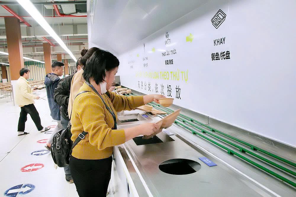 Sau khi công nhân ăn xong sẽ để khay đựng thức ăn tự động vào khu thu gom. |