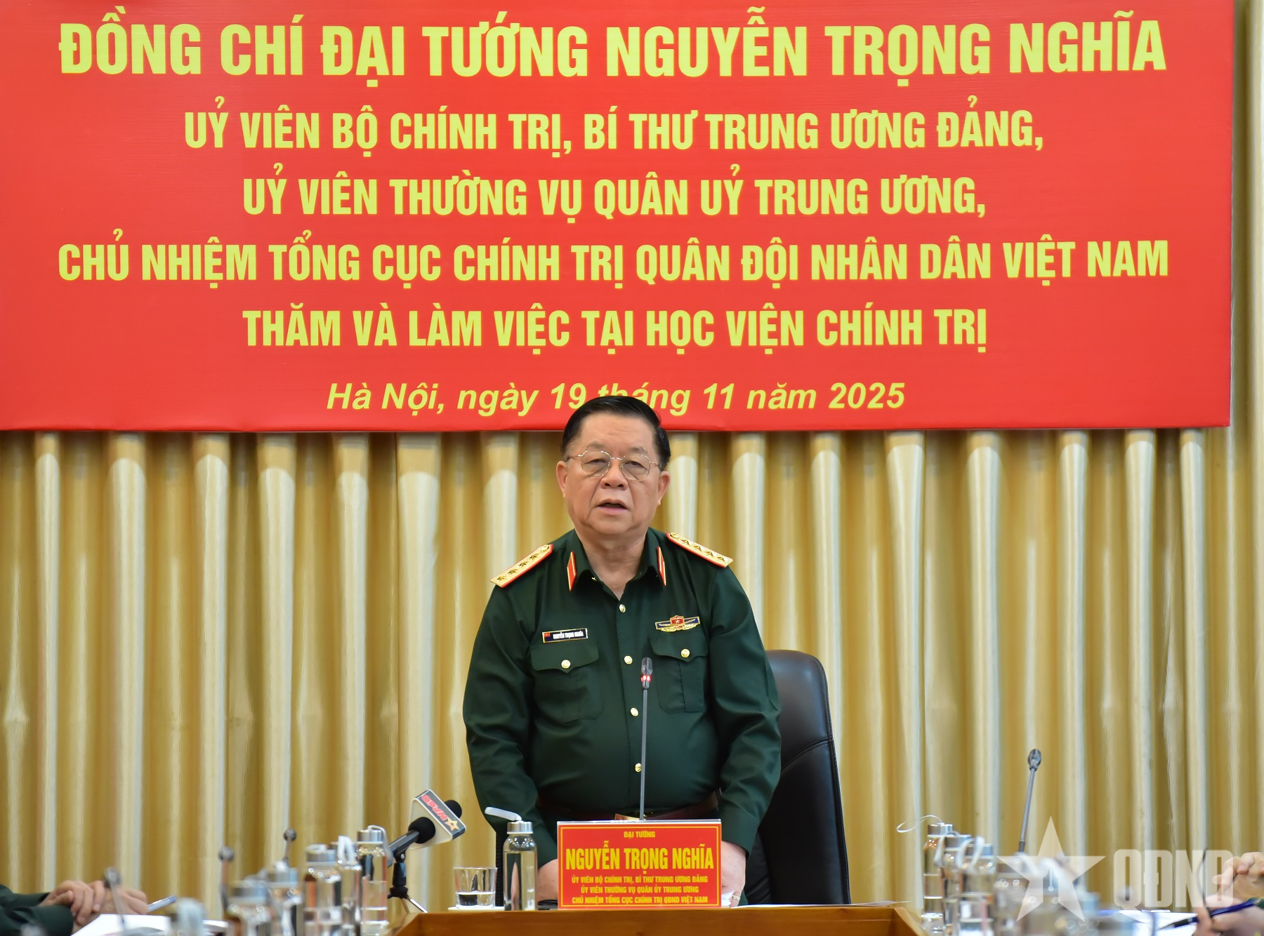 Phát biểu tại buổi làm việc, Đại tướng Nguyễn Trọng Nghĩa bày tỏ vui mừng khi trở lại Học viện Chính trị đúng dịp kỷ niệm Ngày Nhà giáo Việt Nam 20-11, ngày tri ân những người làm công tác giáo dục, đào tạo. Đồng chí đánh giá cao nỗ lực, kết quả nổi bật mà Học viện đạt được trên cả ba lĩnh vực lớn: Giáo dục - đào tạo, nghiên cứu khoa học và xây dựng Đảng bộ Học viện trong sạch, vững mạnh.