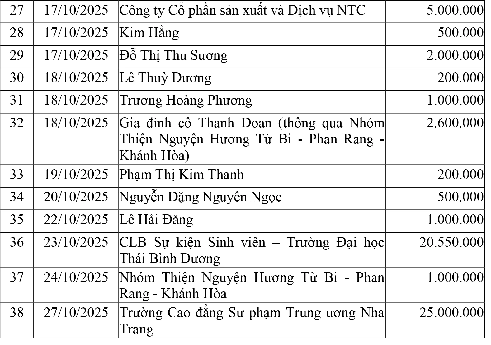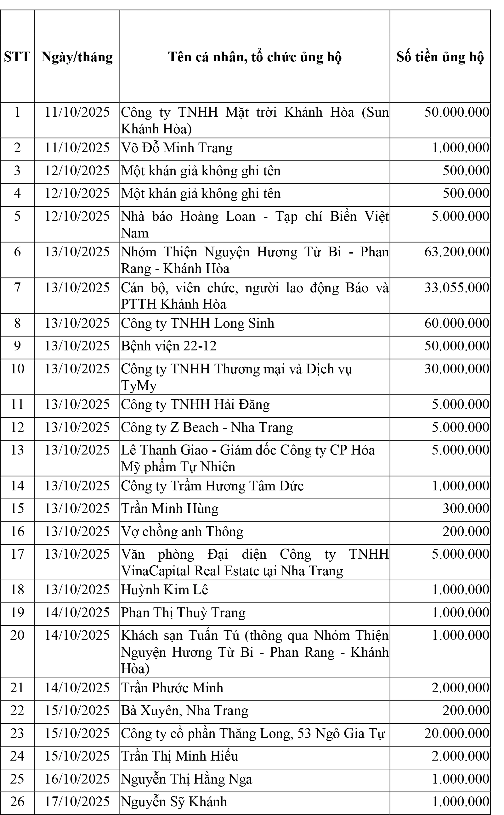 Dưới đây là danh sách tổ chức, cá nhân cùng số tiền ủng hộ do Báo và Phát thanh, Truyền hình Khánh Hòa vận động từ ngày 11-10 đến ngày 27-10-2025.