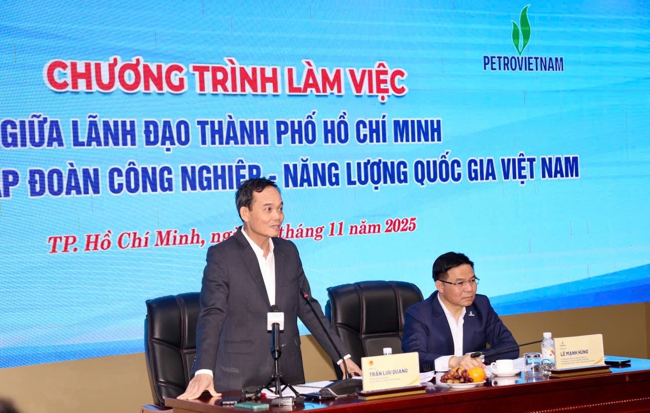 Đồng chí Lê Mạnh Hùng - Bí thư Đảng ủy, Chủ tịch HĐTV Petrovietnam phát biểu cảm ơn sự quan tâm, đồng hành của lãnh đạo TP. Hồ Chí Minh với Petrovietnam