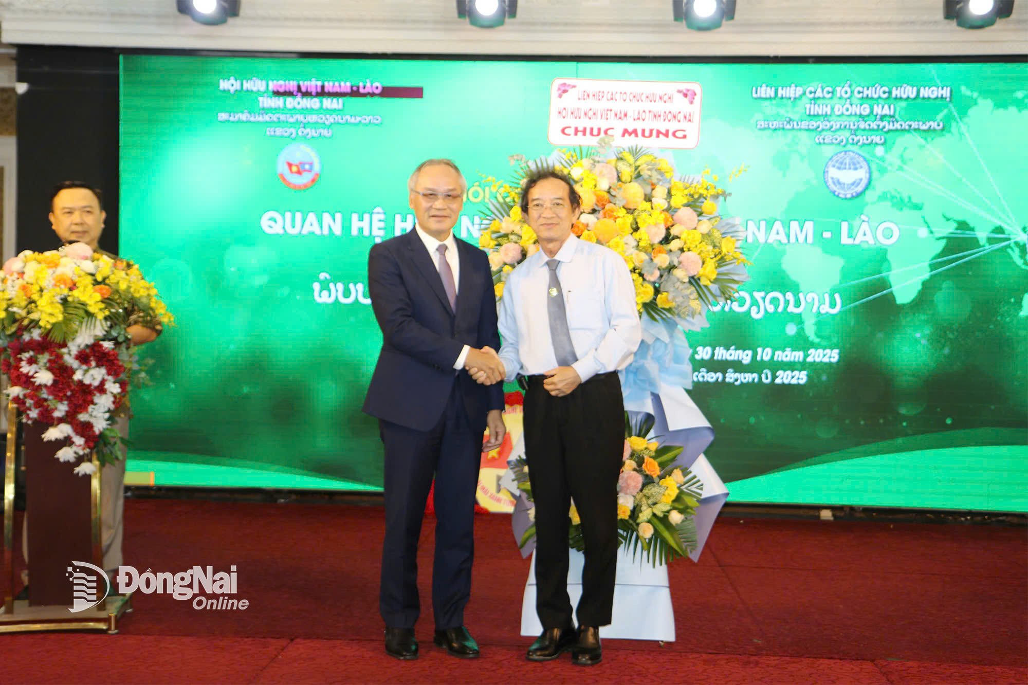 | Chủ tịch Liên hiệp các tổ chức hữu nghị tỉnh Đồng Nai Nguyễn Thành Trí tặng hoa Tổng Lãnh sự Lào tại Thành phố Hồ Chí Minh Phonesy Bounmixay. Ảnh: Văn Truyên |