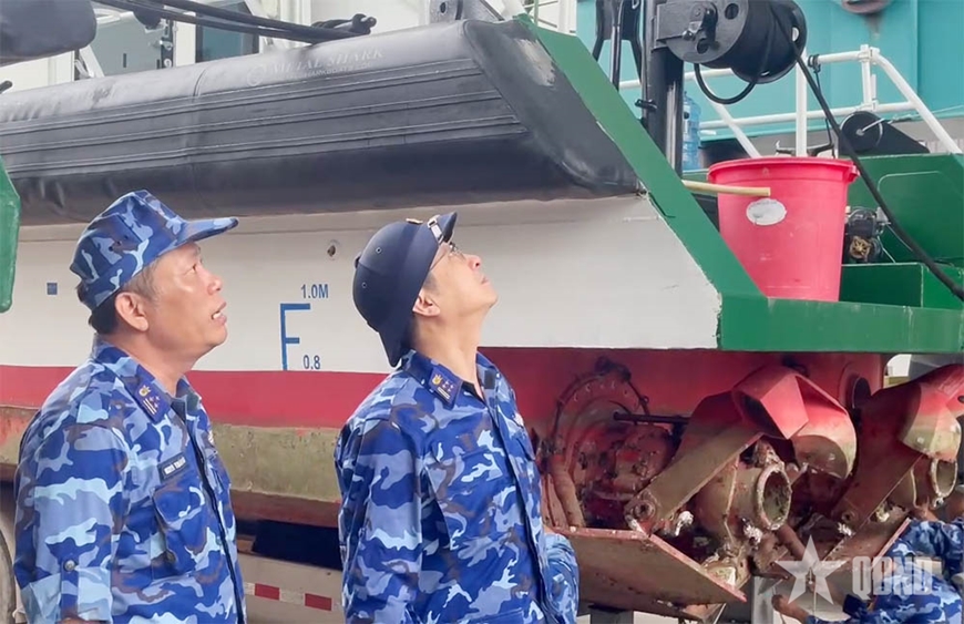 | Đại tá Nguyễn Minh Khánh, Phó tư lệnh, Tham mưu trưởng Vùng Cảnh sát biển 3 kiểm tra phòng, chống bão tại Hải đoàn 32. |