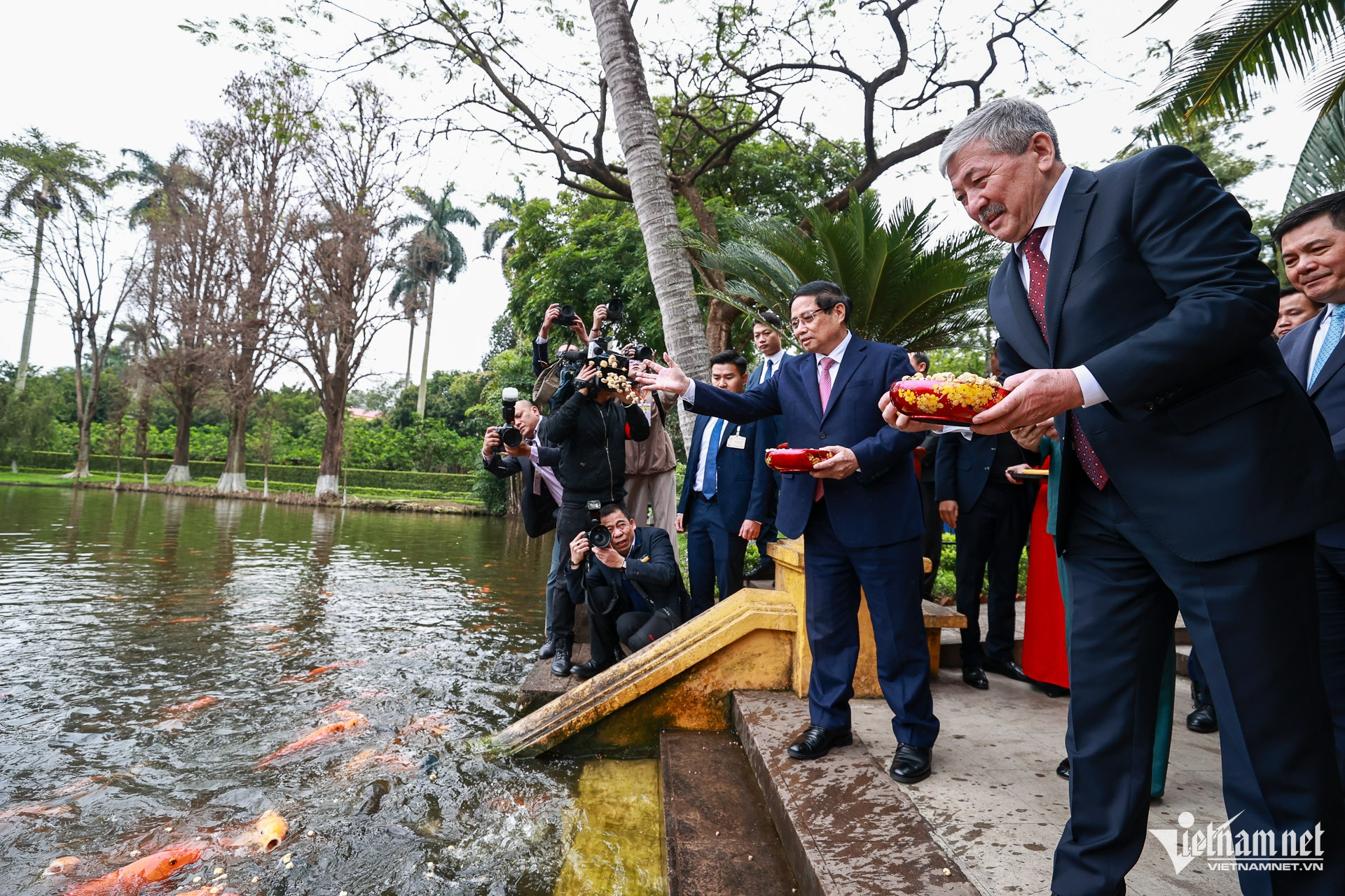 Hai Thủ tướng thăm Ao cá Bác Hồ và cho cá ăn.
