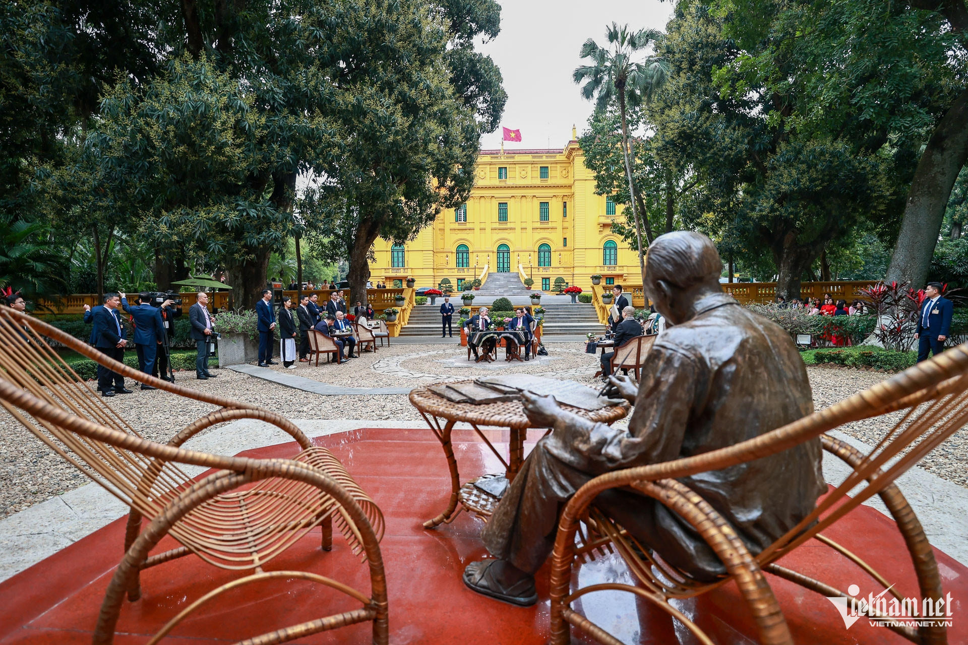 Trước tượng đồng "Bác Hồ ngồi làm việc trong vườn hoa Phủ Chủ tịch", Thủ tướng Phạm Minh Chính mời Thủ tướng Adylbek Kasymaliev thưởng thức cà phê Việt Nam, đồng thời giới thiệu về đường lối đối ngoại và truyền thống văn hóa phong phú, lịch sử hào hùng của dân tộc Việt Nam.