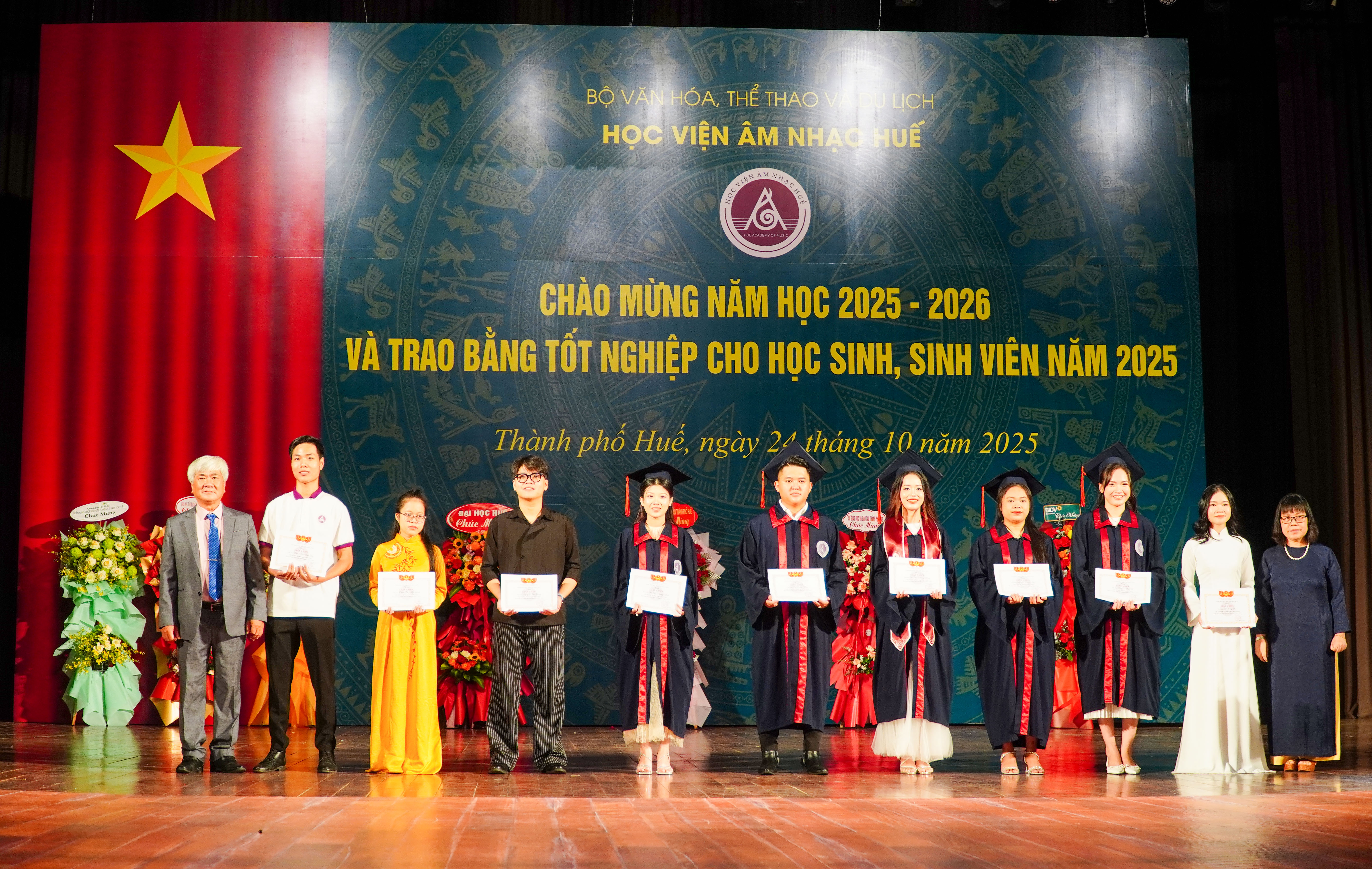 Giám đốc Học viện Âm nhạc Huế trao giấy khen cho học sinh, sinh viên đạt thành tích xuất sắc năm học 2024–2025.