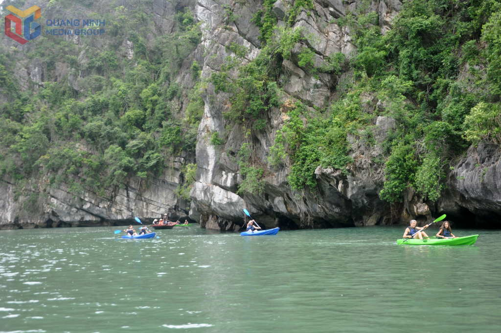 Khách du lịch nước ngoài trải nghiệm chèo kayak tại khu vực Vung Viêng trên Vịnh Hạ Long.