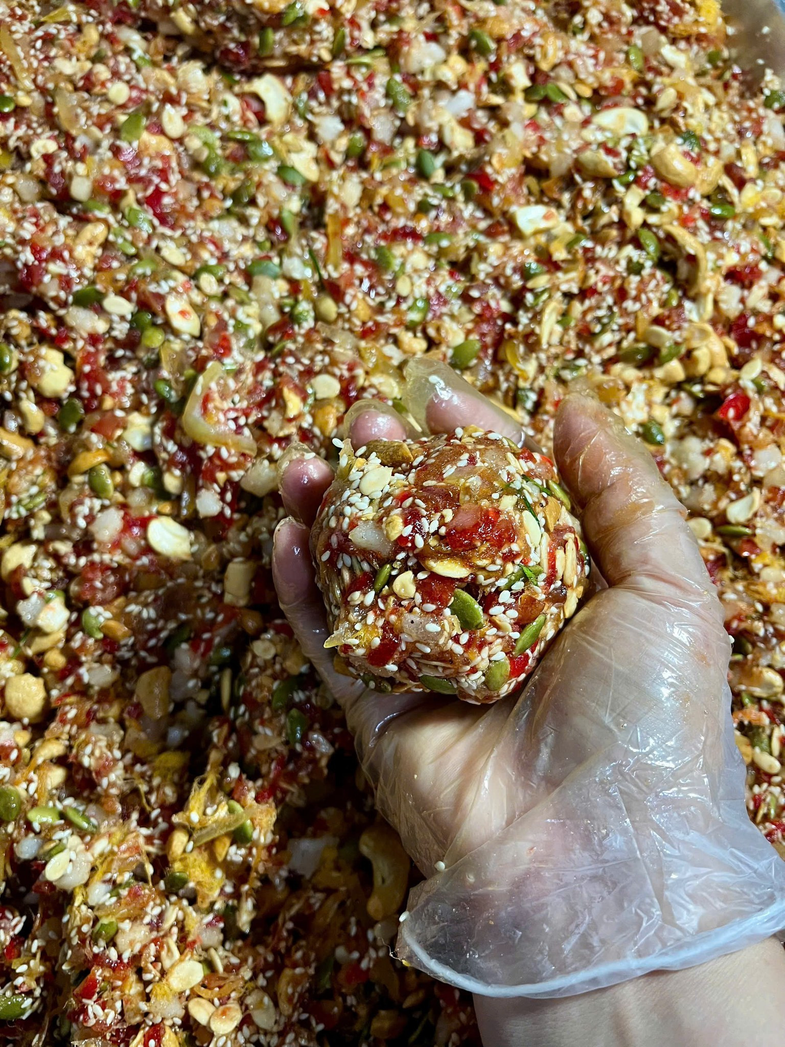 បន្ទាប់មកអ្នករមៀលការបំពេញចូលទៅក្នុងបាល់ដែលមានទំហំប៉ុនកណ្តាប់ដៃរបស់កុមារ។