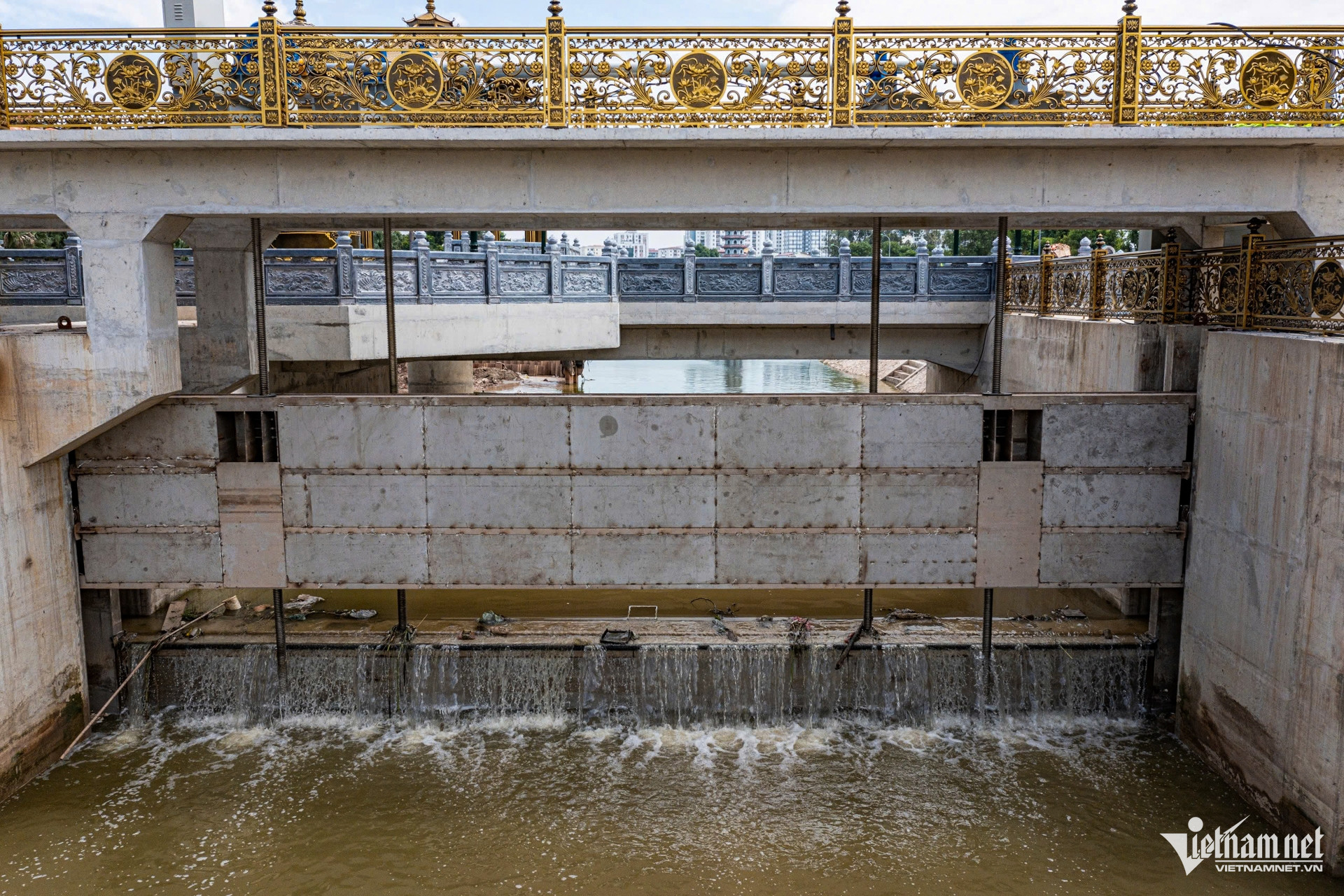 ពីខាងលើពណ៌នៃលំហូរទឹកផ្លាស់ប្តូរយ៉ាងច្បាស់នៅក្នុងតំបន់នេះ។ បច្ចុប្បន្ននេះ ច្រកទ្វារនៃស្ថានីយ៍គ្រប់គ្រងទឹកថាញ លីត ត្រូវបានបិទ ដោយរុញទឹកស្អាតទៅកាន់សាខាទន្លេដែលឆ្លងកាត់ផ្លូវលេខ 250 ផ្លូវ Phan Trong Tue ។
