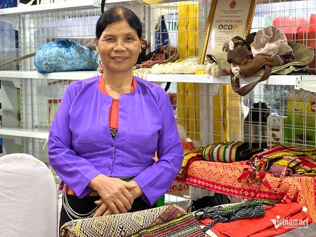 យើងបានជួបនាងនៅក្នុងពិព័រណ៍ណែនាំផលិតផល OCOP ឯកទេសក្នុងតំបន់ដែលប្រព្រឹត្តទៅនៅ ទីក្រុងហាណូយ ។ នាងបានលក់ផលិតផល និងបាននាំយកឧបករណ៍រំកិលកប្បាស ក្រណាត់កន្ទបជាដើម ដើម្បីណែនាំដោយផ្ទាល់នូវដំណើរការនៃការផលិតក្រណាត់អំបោះ ដោយប្រើវិធីសាស្ត្រដោយដៃបែបបុរាណ។