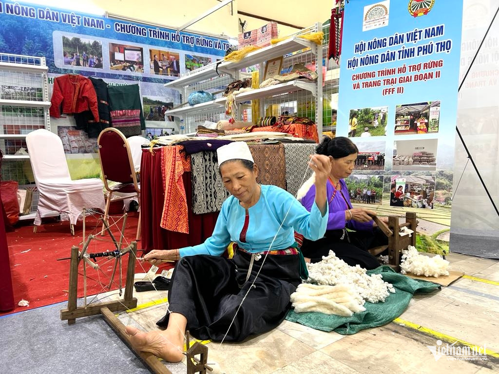 លោកយាយ Huong និងលោកស្រី Mia បាននាំយកឧបករណ៍រំកិលកប្បាស ក្រណាត់កន្ទបជាដើមមកពិព័រណ៍ ដើម្បីណែនាំដោយផ្ទាល់នូវដំណើរការផលិតក្រណាត់អំបោះ ដោយប្រើវិធីដោយដៃបុរាណ។ រូបថត៖ Binh Minh