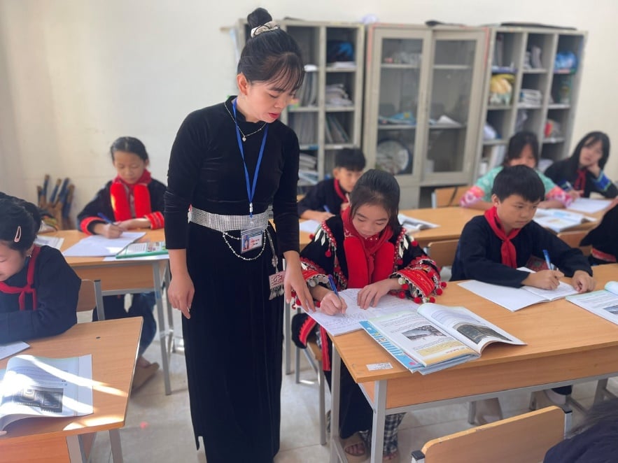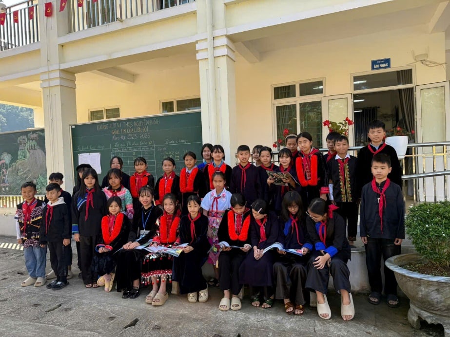លោកគ្រូ Hoang Thi Cuc និងសិស្សានុសិស្សនៃ អនុវិទ្យាល័យ Nguyen Binh សម្រាប់ជនជាតិភាគតិច។