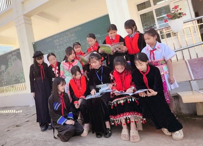 អំឡុងពេលសម្រាកនៅសាលាអនុវិទ្យាល័យ Nguyen Binh សម្រាប់សិស្សសាលាជនជាតិភាគតិច។