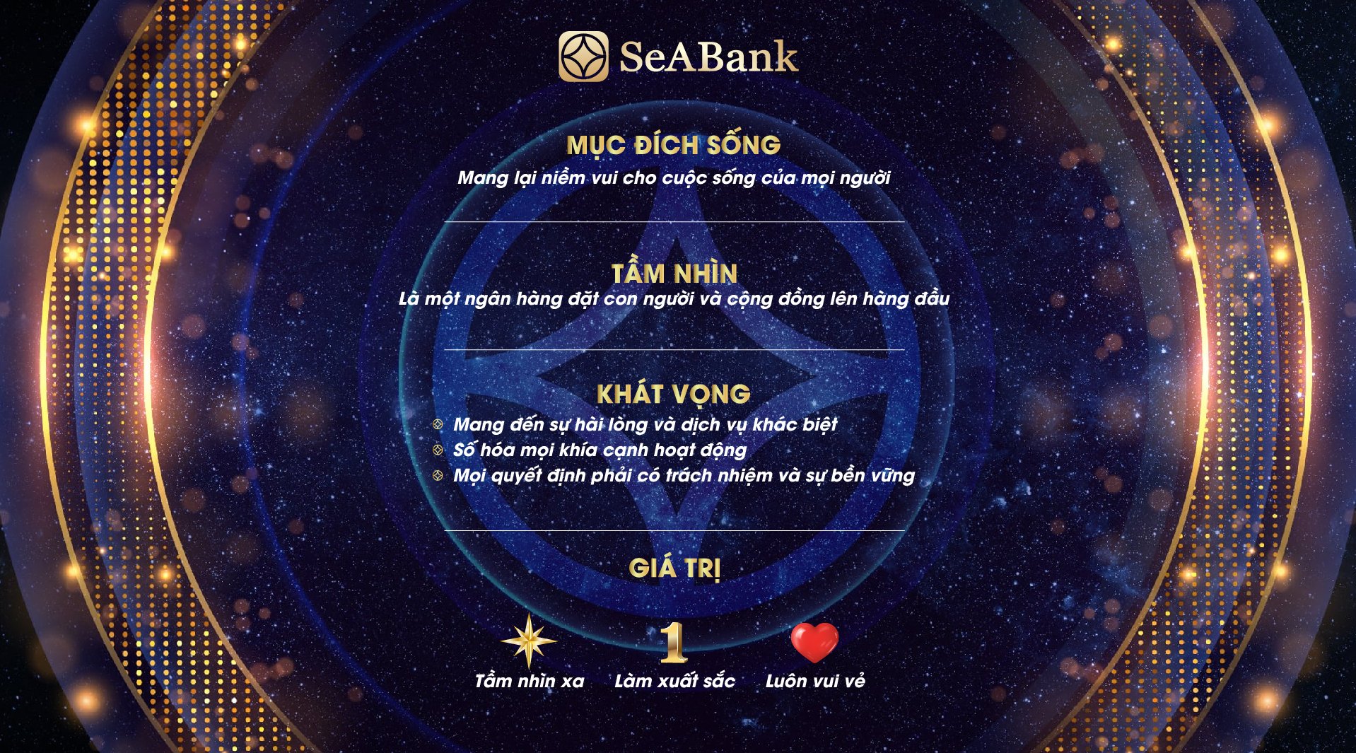 គោលបំណងដើម្បីនាំមកនូវតម្លៃ និងអត្ថប្រយោជន៍ដ៏ល្អប្រសើរដល់ដៃគូ និងអតិថិជនរបស់យើង SeaBank តែងតែមានភាពបត់បែន ច្នៃប្រឌិត និងច្នៃប្រឌិតក្នុងការគិតជាយុទ្ធសាស្រ្ត ខណៈពេលដែលបន្តការអភិវឌ្ឍន៍ប្រកបដោយនិរន្តរភាព។ ដើម្បីសម្រេចបាននូវគោលដៅយុទ្ធសាស្ត្រដែលបានកំណត់ ធនាគារ SeABank បានប្រកាសជាផ្លូវការ នូវក្របខ័ណ្ឌយុទ្ធសាស្រ្តស្តីពីចក្ខុវិស័យ និងតម្លៃស្នូលរបស់ធនាគារ រួមទាំង .