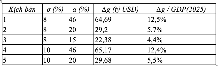 តាមរូបមន្តខាងលើ យើងអាចពិភាក្សាអំពីសេណារីយ៉ូមួយចំនួននៃការវិនិយោគសាធារណៈ។ លទ្ធផលបង្ហាញថា ប្រសិនបើអាមេរិកដាក់ពន្ធខ្ពស់ (α = 46%) ដើម្បីសម្រេចបាននូវកំណើន 8% ឬ 10% នោះ វៀតណាមត្រូវបង្កើនការចំណាយសាធារណៈឱ្យស្មើនឹងជាង 12% នៃ GDP ដែលជាចំនួនដ៏ច្រើននៅក្នុងលក្ខខណ្ឌបំណុលសាធារណៈបច្ចុប្បន្ន។