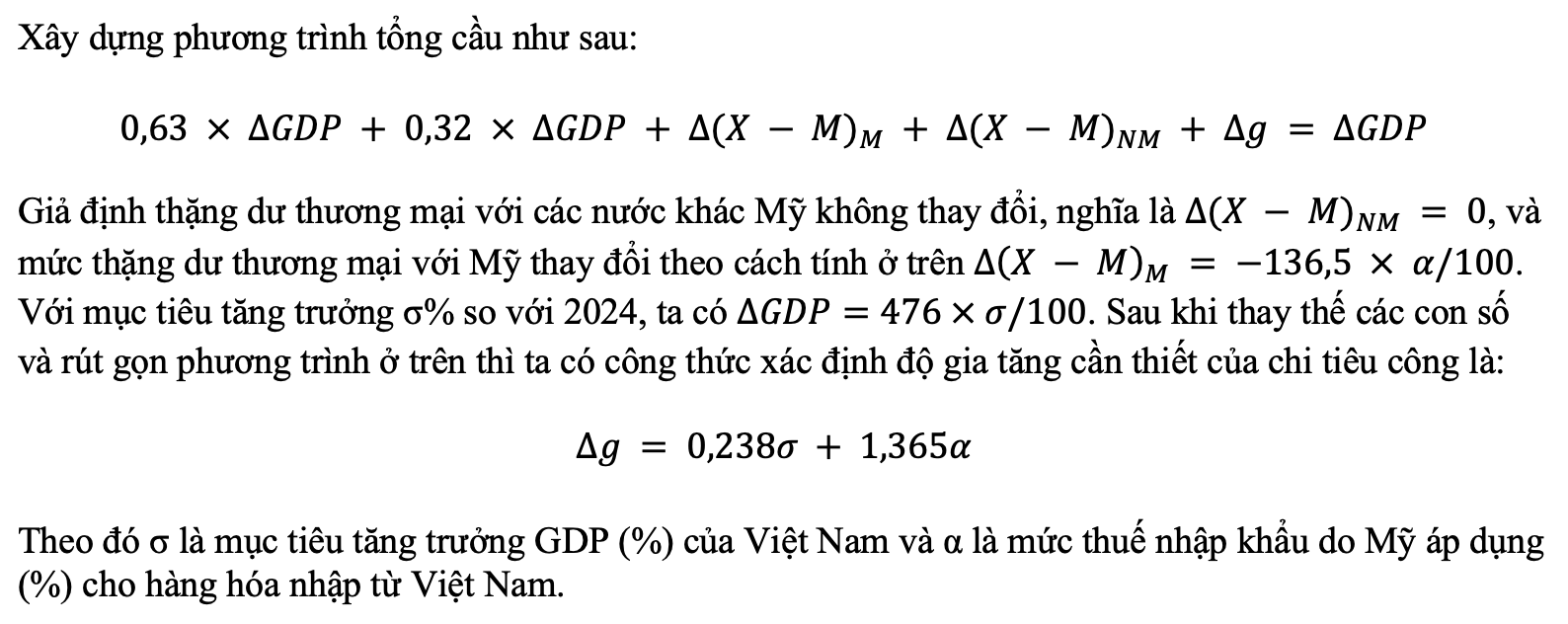ទោះបីជាគ្មានពន្ធអាមេរិកក៏ដោយ ក៏វៀតណាមនៅតែត្រូវការយ៉ាងហោចណាស់ 5% នៃផលិតផលក្នុងស្រុកសរុបពីការចំណាយសាធារណៈ ដើម្បីធានាថាតម្រូវការសរុបមានទំហំធំល្មមដើម្បីបំពេញតាមគោលដៅកំណើន 8% ទៅ 10%។ នេះបង្ហាញថា វៀតណាមមិនអាចពឹងផ្អែកតែលើការប្រើប្រាស់ឯកជន និងការវិនិយោគ (រួមទាំង FDI) ប៉ុន្តែត្រូវការគោលនយោបាយសារពើពន្ធសកម្ម។