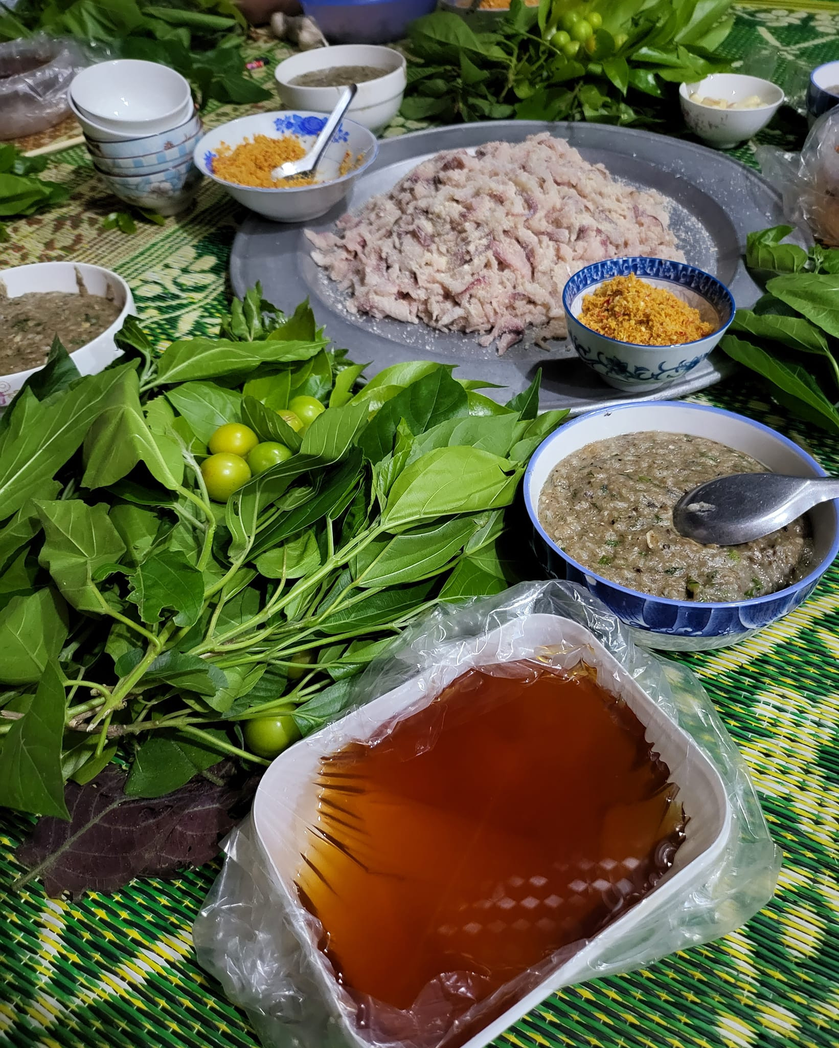 ក្រោយពីរៀបចំសាច់រួច មនុស្សក៏បន្តធ្វើទឹកជ្រលក់សាឡាដ (តាមស្រុកគេហៅថា «មួក»)។