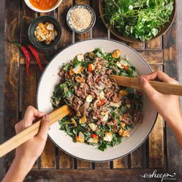 ទឹកត្រីប្រឡាក់ជាមួយសាច់គោ ច្រើនតែប្រោះជាមួយសណ្តែកដីលីង ហើយញ៉ាំជាមួយទឹកត្រីផ្អែម និងជូរ។ រសជាតិជូររបស់បន្លែក្រៀម លាយឡំជាមួយរសជាតិដ៏សម្បូរបែបនៃសាច់គោ និងរសជាតិខ្លាញ់របស់សណ្តែកដី ធ្វើឱ្យអ្នកណាដែលញ៉ាំវាម្តងចងចាំជារៀងរហូត។