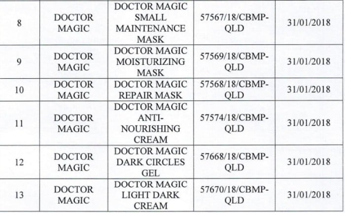ខាងក្រោមនេះជាបញ្ជីផលិតផលគ្រឿងសំអាងចំនួន 162 មុខ ក្រោមម៉ាក Doctor Magic, Maika Beauty និង MK របស់ក្រុមហ៊ុន MK Skincare ដែលទាក់ទងនឹងប្រព័ន្ធ។ ហាងកែសម្ផស្ស Mailisa ។