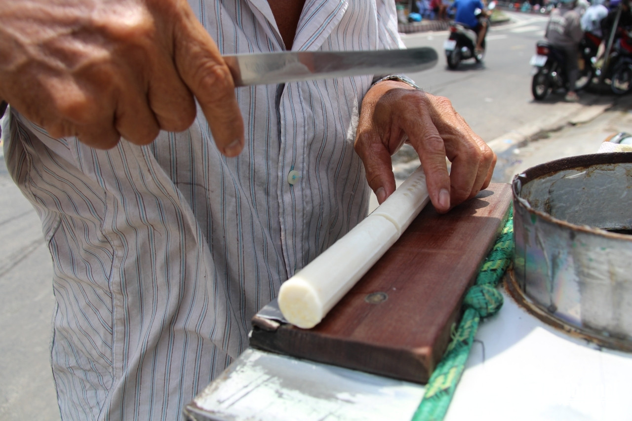 អស់រយៈពេល ៤២ ឆ្នាំមកហើយ លោក ហៀន បានរក្សារូបមន្តការ៉េមបំពង់បែបប្រពៃណីដដែល។ ការ៉េមរបស់គាត់គឺធ្វើដោយដៃពីទឹកដោះគោដូង និងសណ្តែក។