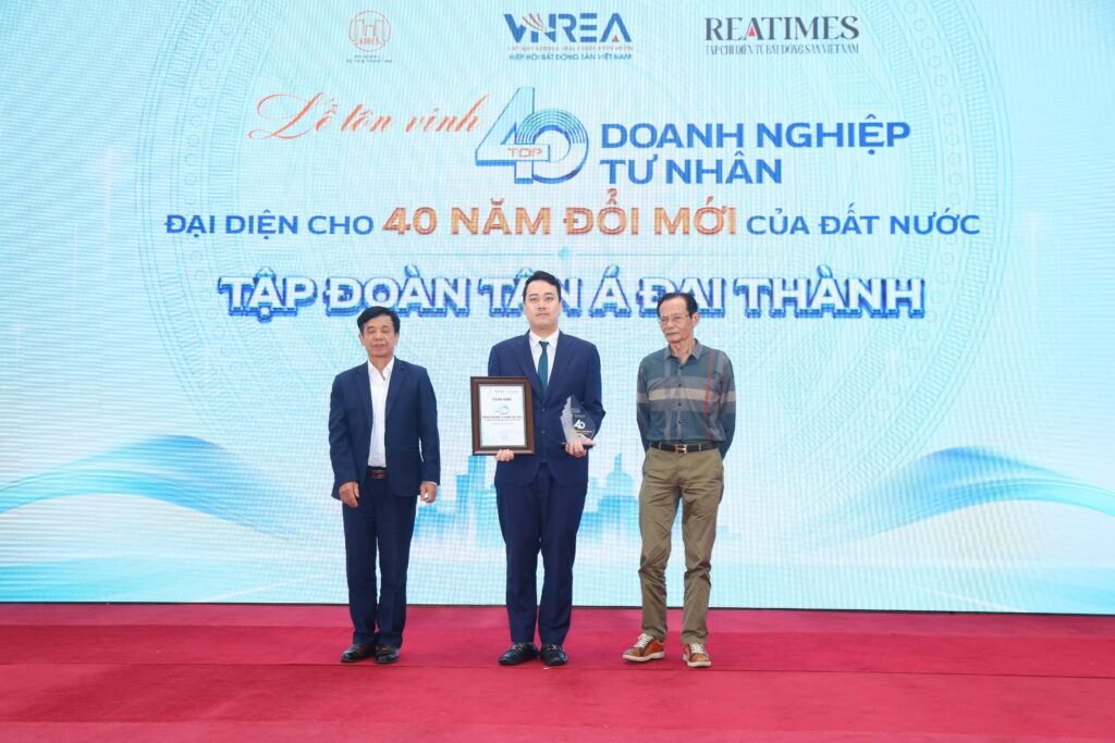 | ជាមួយនឹងដំណើរជាងបីទស្សវត្សរ៍នៃការបង្កើតតម្លៃឥតឈប់ឈរ ក្រុមហ៊ុន Tan A Dai Thanh Group ជាថ្មីម្តងទៀតបានអះអាងជំហររបស់ខ្លួនជាសហគ្រាសវៀតណាមត្រួសត្រាយនៅពេលដែលខ្លួនត្រូវបានផ្តល់កិត្តិយសនៅក្នុងសហគ្រាសឯកជនឆ្នើមទាំង 40 បន្ទាប់ពី 40 ឆ្នាំនៃការបង្កើតថ្មី ដែលជានិមិត្តសញ្ញានៃស្មារតី "គិតធំ ធ្វើពិតប្រាកដ និង រួមចំណែកជាបន្តបន្ទាប់"។ នាថ្ងៃទី 8 ខែតុលា ឆ្នាំ 2025 ក្រុមហ៊ុន Tan A Dai Thanh Group មានកិត្តិយសត្រូវបានដាក់ឈ្មោះក្នុងសហគ្រាសឯកជនឆ្នើម 40 បន្ទាប់ពី 40 ឆ្នាំនៃការច្នៃប្រឌិត ក្លាយជាតំណាងធម្មតានៃសេចក្តីប្រាថ្នាអភិវឌ្ឍន៍របស់សហគ្រាសវៀតណាមក្នុងដំណើររួមដំណើរជាមួយប្រទេស។ កម្មវិធីនេះត្រូវបានរៀបចំឡើងដោយទស្សនាវដ្ដីអេឡិចត្រូនិកវៀតណាម (Reatimes) និងវិទ្យាស្ថានស្រាវជ្រាវអចលនទ្រព្យវៀតណាម (VIRES) ក្រោមការដឹកនាំរបស់សមាគមអចលនទ្រព្យវៀតណាម ក្នុងឱកាសរំលឹកខួបលើកទី 21 នៃទិវាសហគ្រិនវៀតណាម។ តំណាងក្រុមហ៊ុន លោក Nguyen Anh Tu - អគ្គនាយករងអចិន្ត្រៃយ៍បានចូលរួម និងទទួលនិមិត្តសញ្ញាកិត្តិយសពីគណៈកម្មាធិការរៀបចំ។