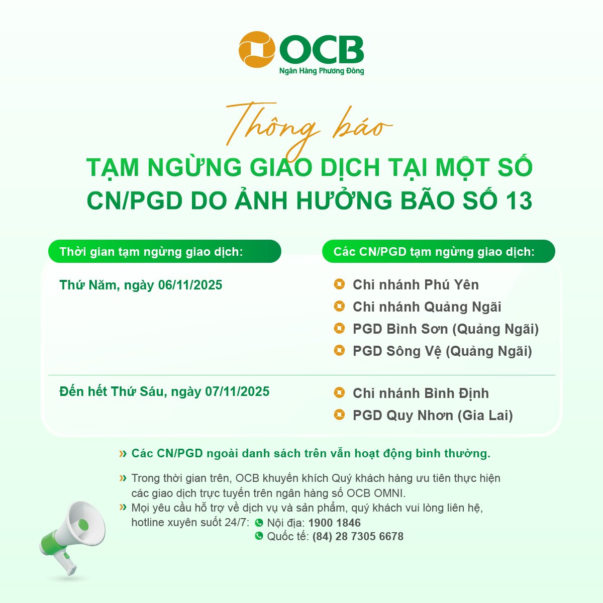 សេចក្តីជូនដំណឹងស្តីពីការផ្អាកប្រតិបត្តិការបណ្តោះអាសន្ននៅសាខា/ការិយាល័យប្រតិបត្តិការមួយចំនួន ដោយសារឥទ្ធិពលព្យុះលេខ១៣