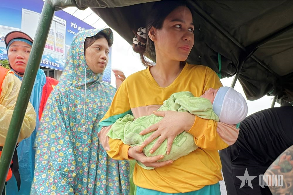 | ម្តាយនិងទារកវ័យក្មេងត្រូវបានអ្នកជួយសង្គ្រោះដឹកឆ្លងកាត់ទឹកខ្ពស់ដោយធានាសុវត្ថិភាពដាច់ខាតមុនពេលឡើងទូក។ |