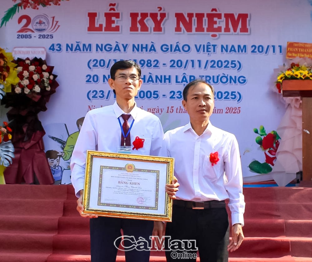 សមមិត្ត Phan Thanh Don អនុលេខាគណៈកម្មាធិការបក្ស នាយករងវិទ្យាល័យ Ninh Thanh Loi (ឆ្វេង) បានទទួលវិញ្ញាបនបត្រកុសល ពីគណៈកម្មការឃោសនា និងចលនាមហាជនមជ្ឈិម ចំពោះសមិទ្ធិផលក្នុងការសិក្សា និងអនុវត្តតាមមនោគមវិជ្ជា សីលធម៌ និងរបៀបរស់នៅរបស់ហូជីមិញ នាឆ្នាំ២០២៥ ក្នុងពិធីរំលឹកខួបអនុស្សាវរីយ៍លើកទី២០ នៃទិវាបង្កើតគ្រូវៀតណាម។