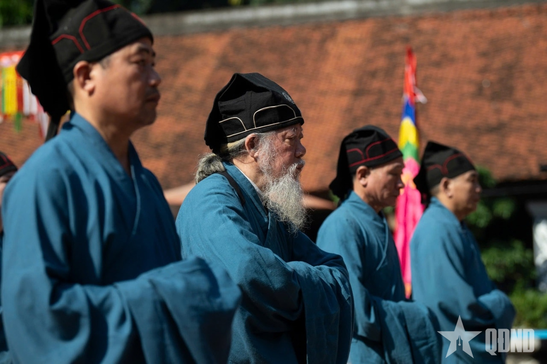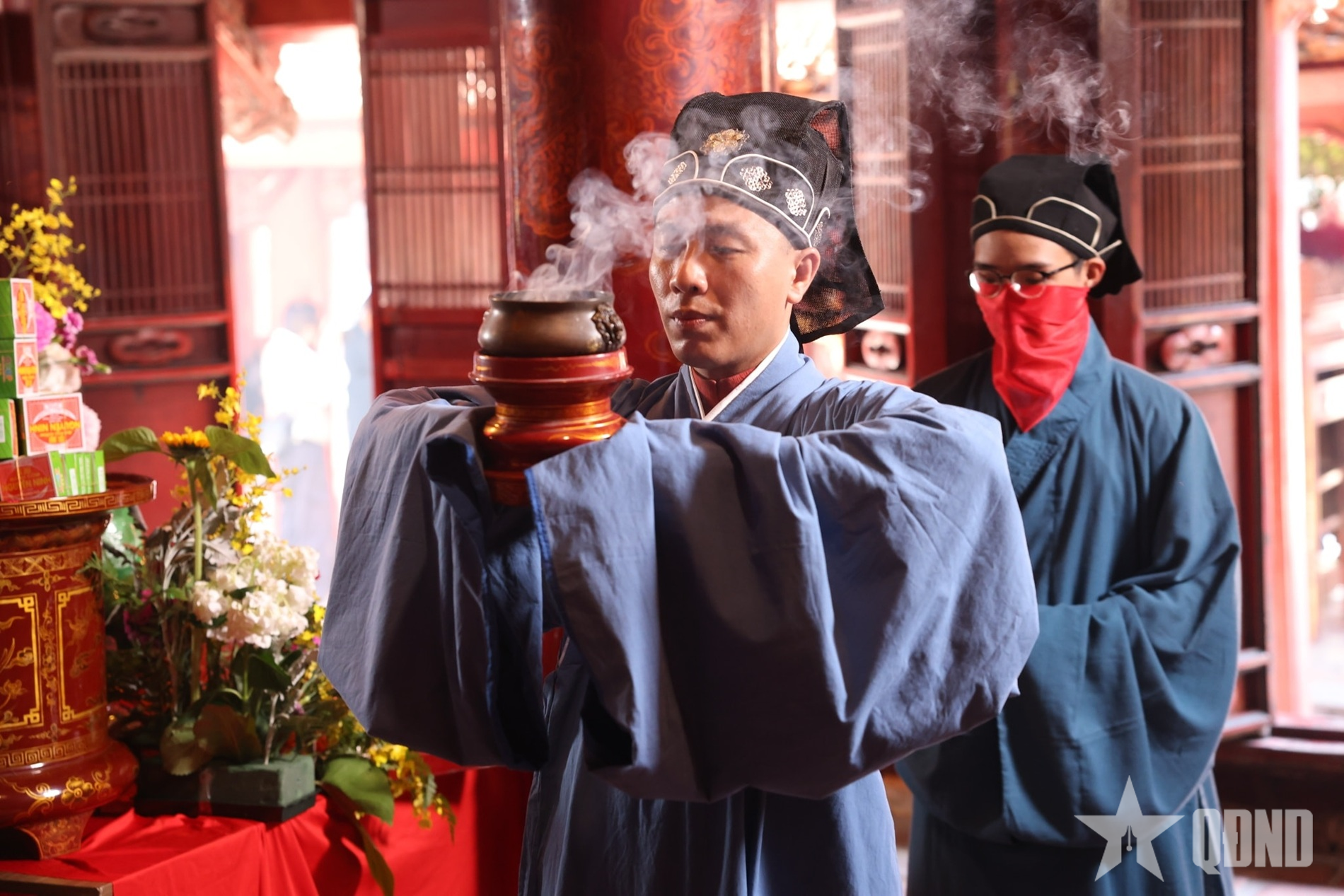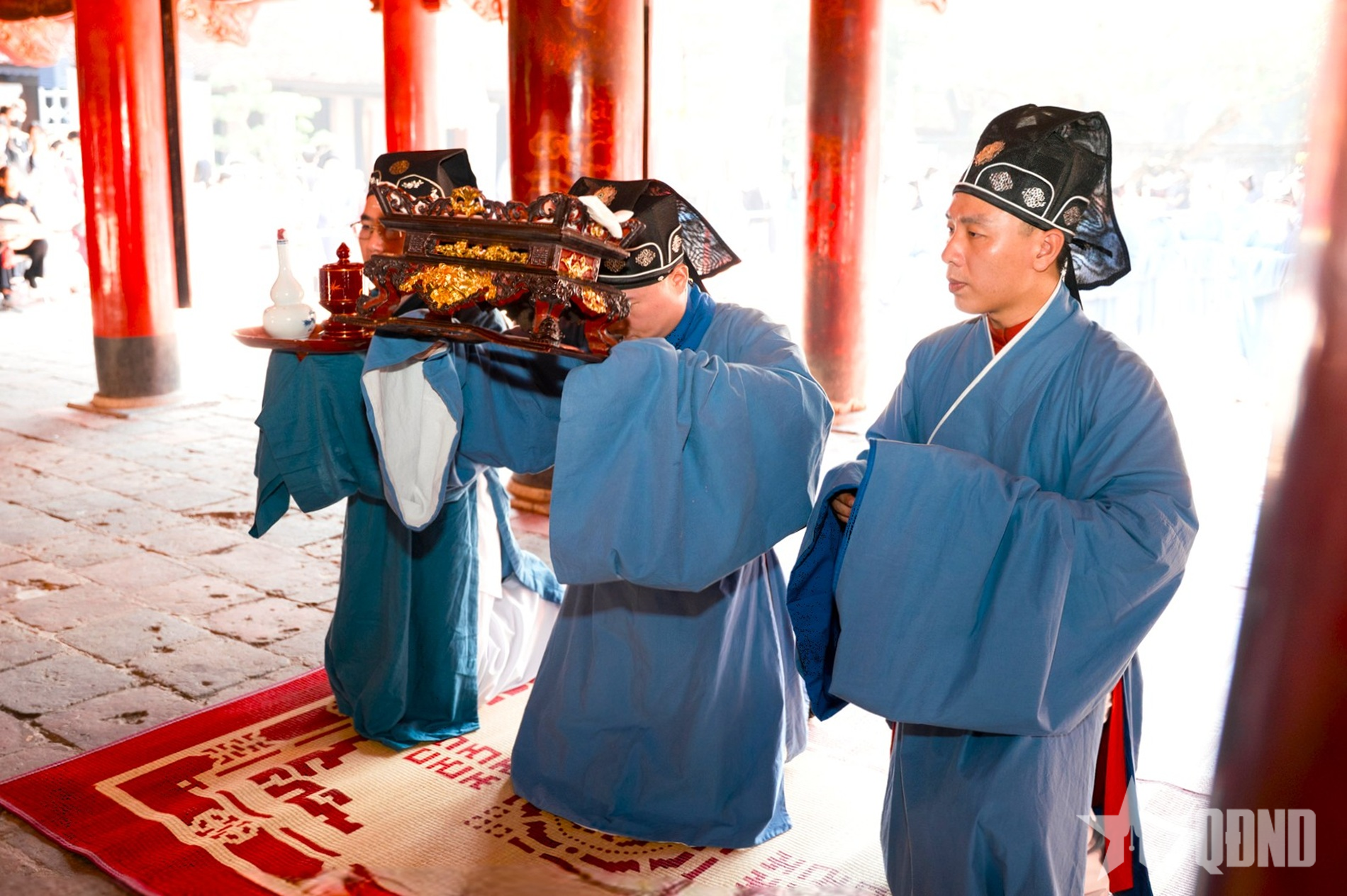 នៅព្រឹកព្រលឹម ពន្លឺព្រះអាទិត្យនៅតែគ្របដណ្ដប់ដោយអ័ព្ទ ក្បួនដង្ហែពីបឹងវ៉ាន់ចូលទៅក្នុងប្រាសាទខាងក្នុង ទង់ដ៏ត្រចះត្រចង់ លាយឡំជាមួយនឹងភ្លេងពិណពាទ្យ ធ្វើឱ្យលំហបូរាណហាក់មានជីវិតរស់រវើកជាច្រើនសតវត្ស។ នៅកណ្តាលទីធ្លាព្រះបរមរាជវាំង Dai Thanh អាវផាយនីមួយៗនៃពិធីគឺសំប៉ែត ធូបក្រអូបបានបក់បោកតាមខ្យល់ បង្កើតបានជាទិដ្ឋភាពដ៏ពិសិដ្ឋ និងដ៏ឧឡារិក។ អាស្រ័យហេតុនេះ បង្ហាញពីភាពរស់រវើកនៃប្រពៃណីទំនៀមទំលាប់ និងភាពស្រស់ស្អាតយ៉ាងជ្រាលជ្រៅនៃ "ប្រាសាទដ៏ពិសិដ្ឋនៃការសិក្សា" នៅកណ្តាល ទីក្រុងហាណូយ ។