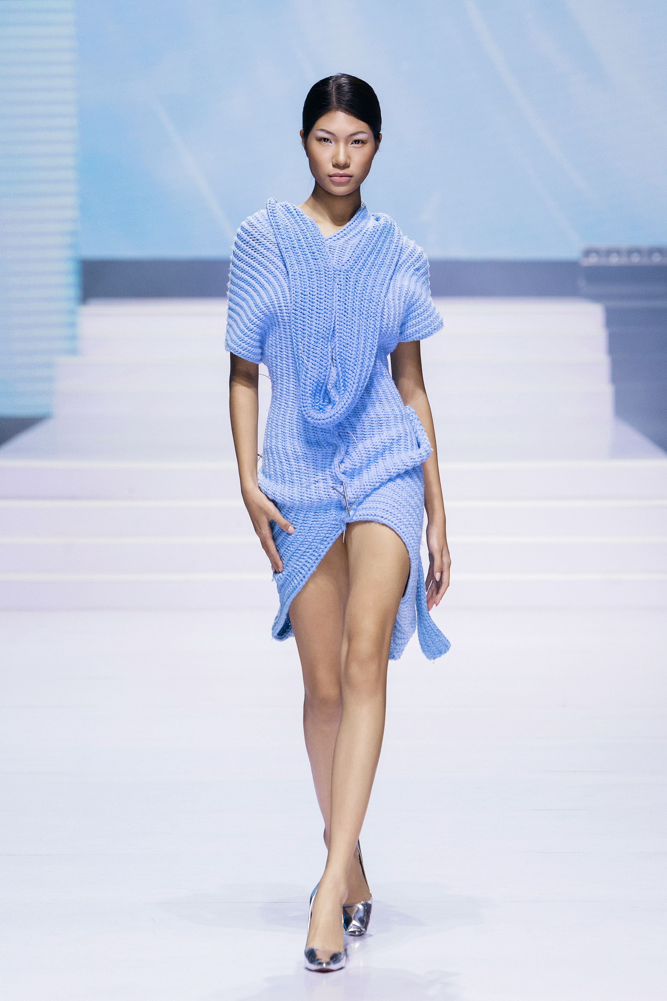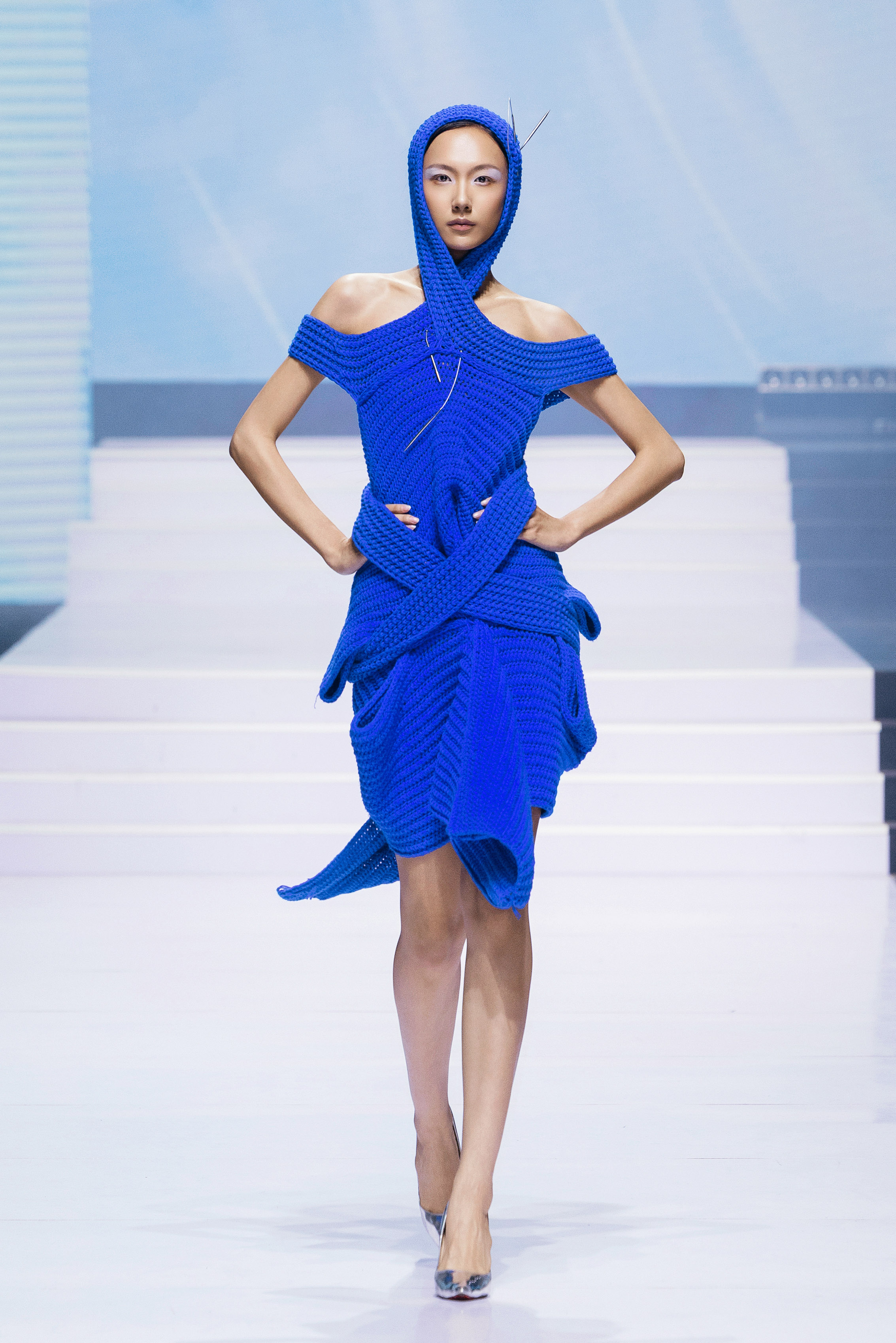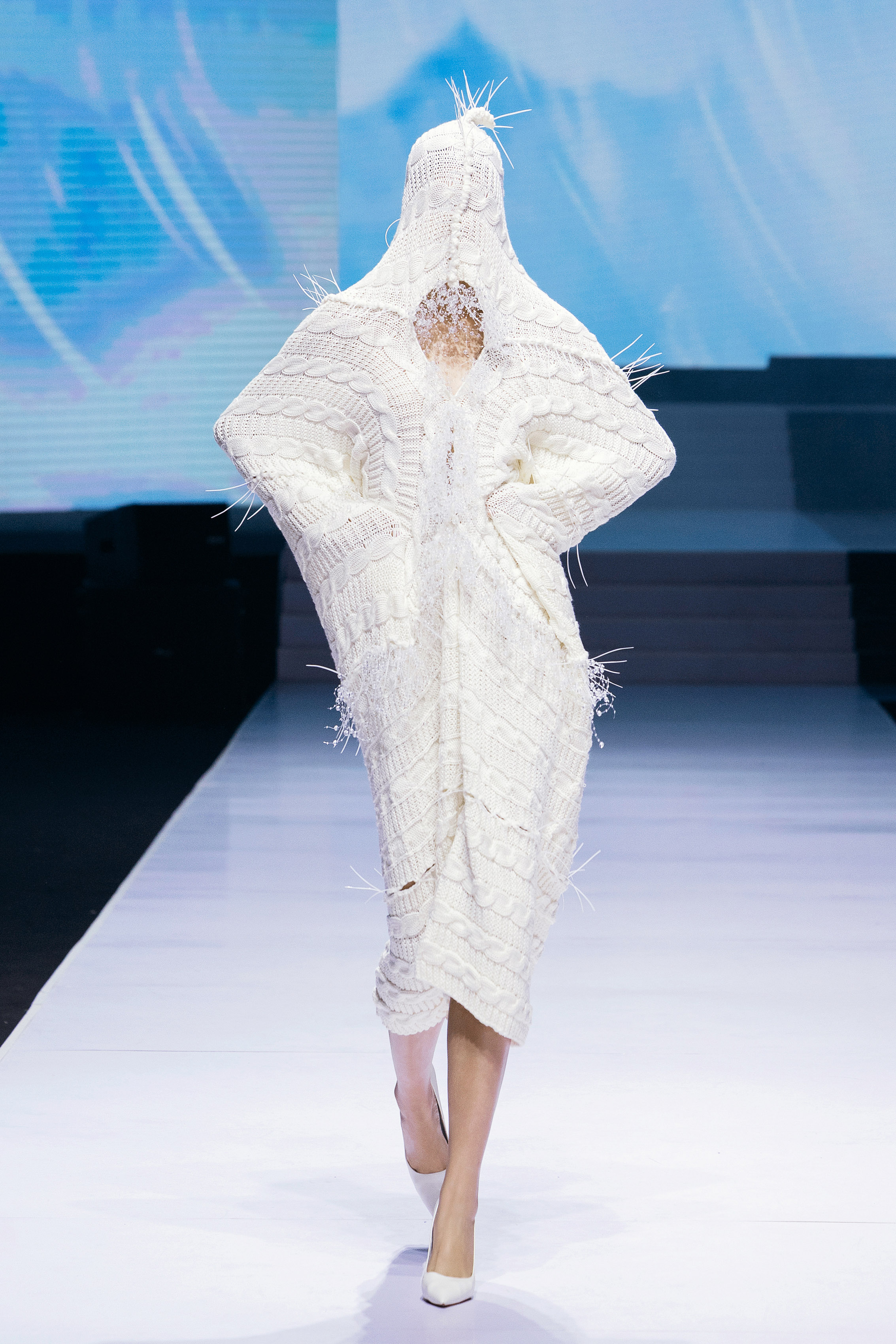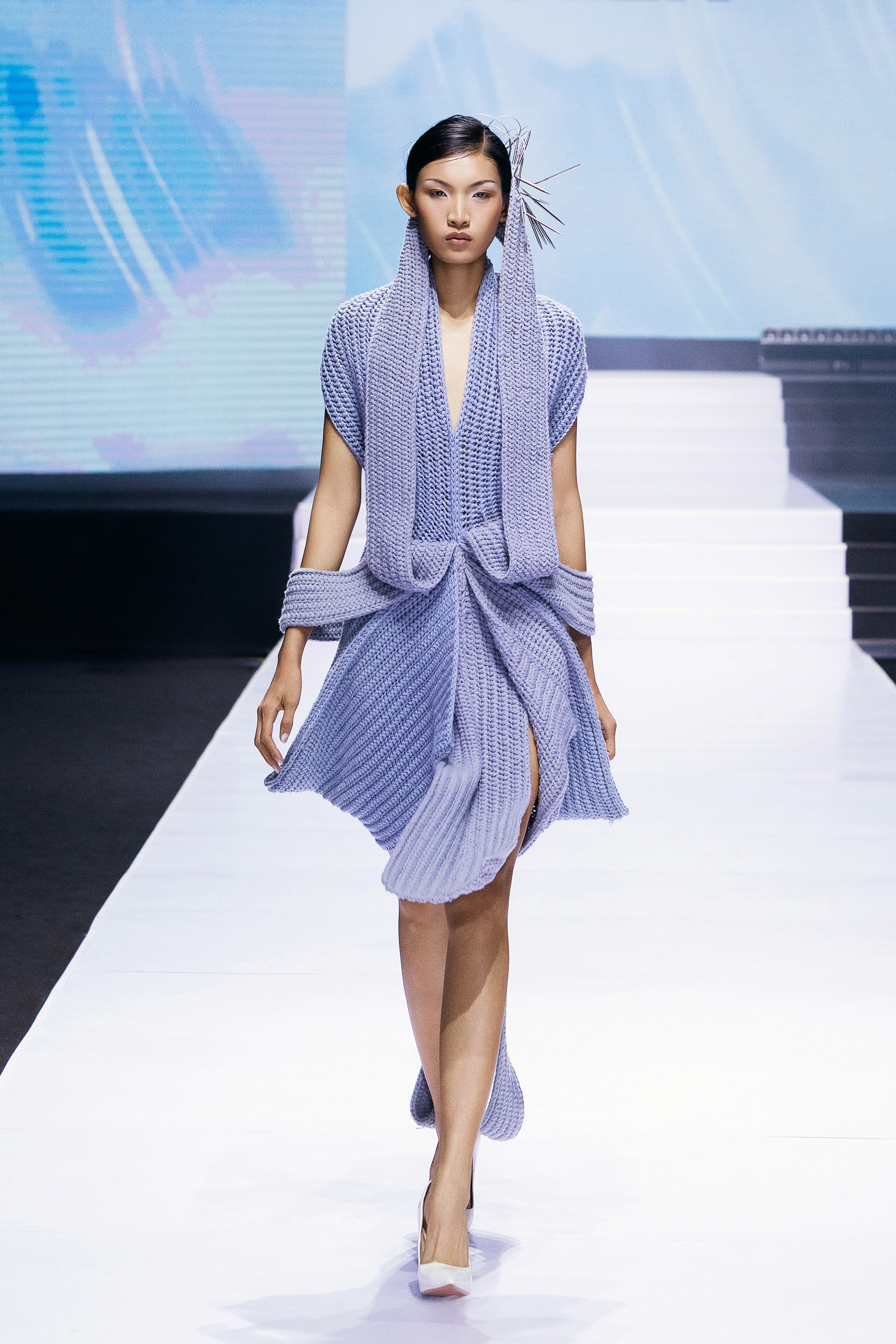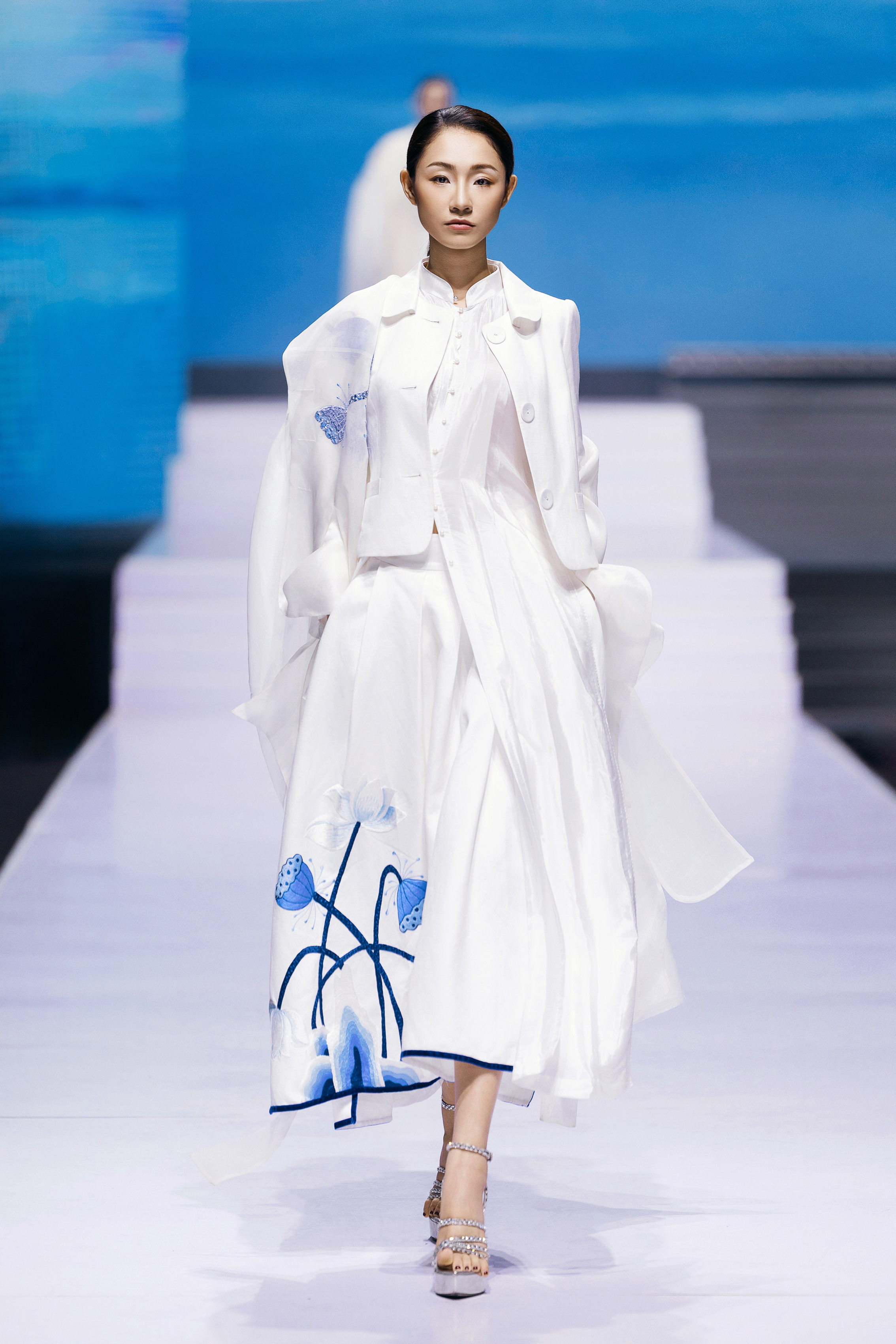 ការរចនាសូត្រពណ៌សប្រាក់នៅលើផ្ទាំងក្រណាត់សូត្រ និងផ្ទាំងក្រណាត់ដ៏ភ្លឺចែងចាំងនាំអ្នកទស្សនាក្នុងដំណើរនៃទឹក ដែលជានិមិត្តរូបនៃប្រភពដើម និងការកើតជាថ្មី។ ការបន្លិចនៃសំលៀកបំពាក់ស្ថិតនៅក្នុងរចនាសម្ព័ន្ធរាងជារង្វង់ 3D ដែលបង្ហាញរូបភាពនៃដំណក់ទឹកក្នុងចលនាថេរ ទាំងផ្នែកទន់ និងស្ថាបត្យកម្ម។