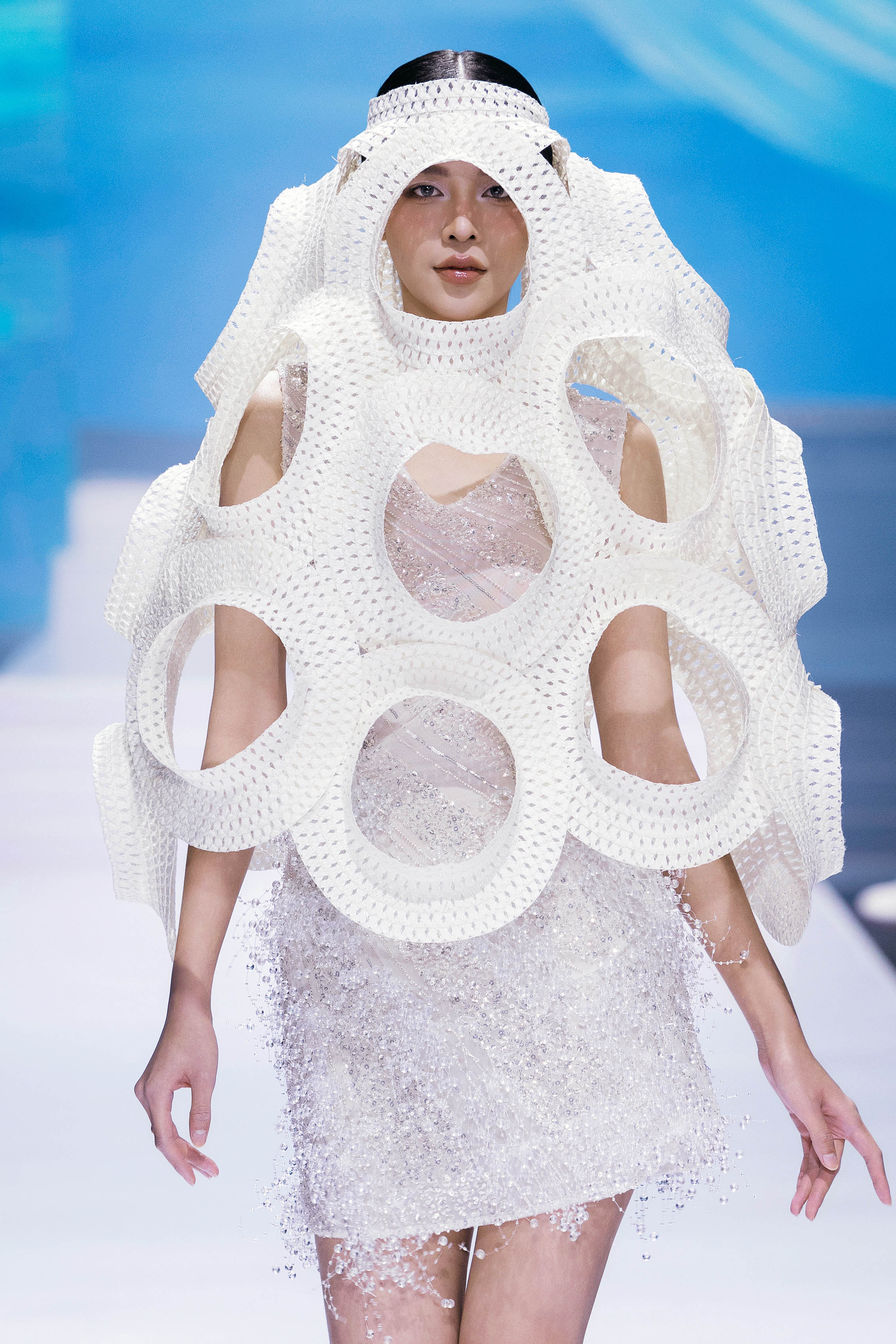 Lai Mai Hoa បានបង្ហាញពីការរចនា vedette នៃបណ្តុំនេះ។ ម្ចាស់ជើងឯកនៃ ម៉ូដែល Next Top Model 2025 របស់វៀតណាម បានបញ្ចេញពន្លឺនៅក្នុងការរចនាពណ៌បៃតងត្បូងមរកតជាមួយនឹងផ្កា 3D ធ្វើដោយដៃ សំពត់ដែលមានភាពស្រើបស្រាលបានបង្កើតឥទ្ធិពលដែលគួរឱ្យចាប់អារម្មណ៍។