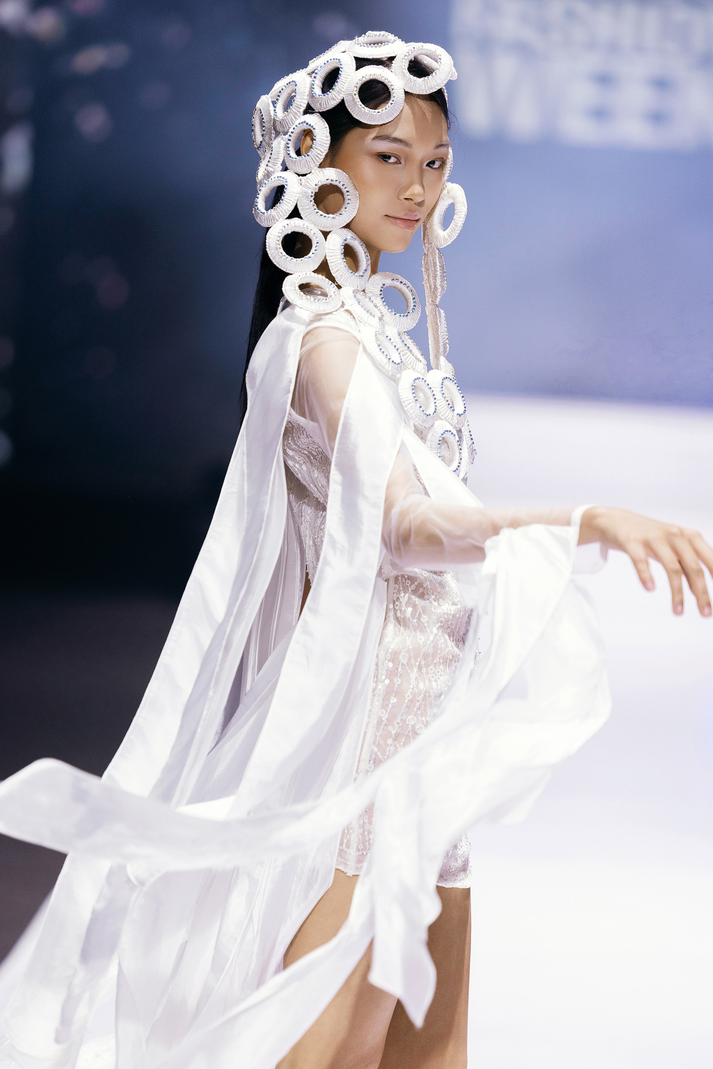 កញ្ញា Thanh Thuy បានធ្វើការរចនាម៉ូដដ៏គួរឱ្យចាប់អារម្មណ៍។ នៅលើរ៉ូបខ្នាតតូចពណ៌ប្រាក់ជាមួយនឹងឈុតផ្កាភ្លើង អ្នករចនាបានគ្របដណ្តប់រាងកាយផ្នែកខាងលើជាមួយនឹងរូបចម្លាក់ 3D នៃរង្វង់ពណ៌សដែលជាប់ទាក់ទងគ្នាដូចជាពពុះទឹកដែលកំពុងឡើងពីលើរលក។ រចនាសម្ព័នដែលគ្របលើក្បាល និងស្មា បង្កើតជាកន្លែងមើលឃើញជាក់ស្តែង ទាំងទន់ និងខ្លាំង។