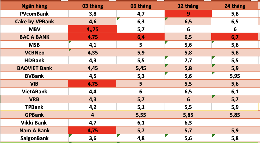 Vikki Bank áp dụng lãi suất 7,5%/năm cho tiền gửi kỳ hạn từ 13 tháng trở lên, với số tiền tối thiểu 999 tỉ đồng; Bac A Bank đang áp dụng mức lãi suất cao nhất 6,5%/năm cho các kỳ hạn từ 18 đến 36 tháng, 6,3%/năm với kỳ hạn 13–15 tháng và 6,1%/năm, kỳ hạn 6-8 tháng ở mức 6%/năm, kỳ hạn 9-11 tháng là 6,05%/năm, kỳ hạn 12 tháng là 6,2%/năm.