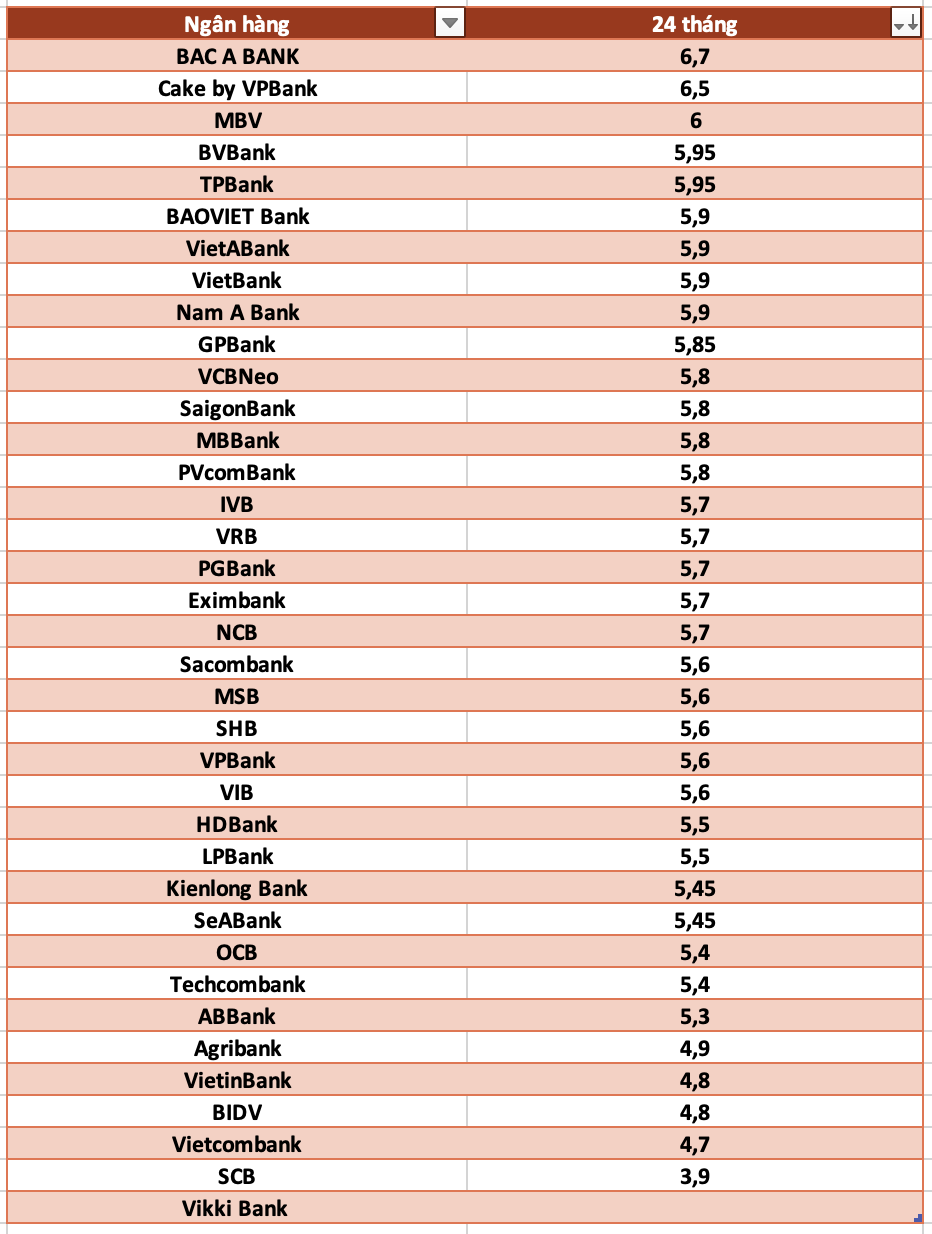 HDBank áp dụng mức lãi suất 6%/năm cho kỳ hạn 15 tháng và 6,1%/năm cho kỳ hạn 18 tháng; BVBank cũng chi trả 6,1%/năm cho kỳ hạn 60 tháng và 6,0%/năm cho kỳ hạn 48 tháng. Viet A Bank duy trì mức 6,0%/năm duy nhất ở kỳ hạn 36 tháng.
